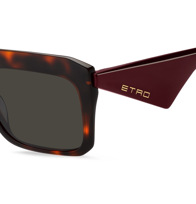 Playful, dynamic and rebellious, the "ETRO Tailoring" eyewear range returns with a renewed edge. These sunglasses explore the collection's theme with their generous volumes and sinuous shapes. Crafted with expert precision from ultra-light acetate, the softly curved profile is complemented by the vintage-inspired triangular temples. The brand's iconic end tips and subtle logo lettering transcend seasons and trends.