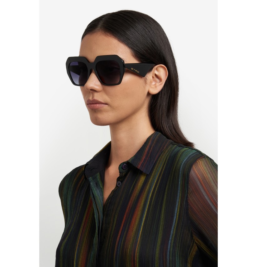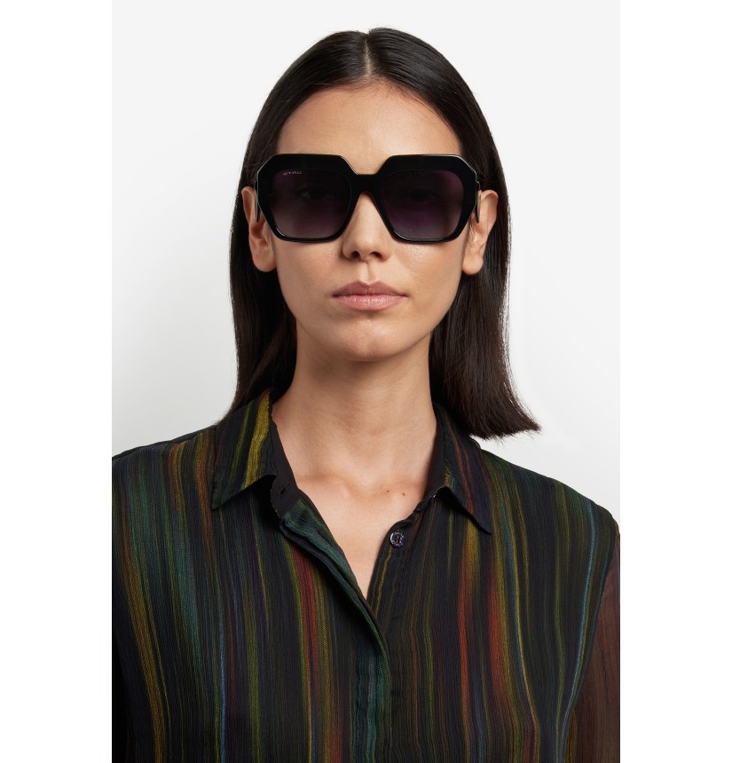 Playful, dynamic and rebellious, the "ETRO Tailoring" eyewear range returns with a renewed edge. These sunglasses explore the collection's theme with their generous volumes and sinuous shapes. Crafted with expert precision from ultra-light acetate, the softly curved profile is complemented by the vintage-inspired triangular temples. The brand's iconic end tips and subtle logo lettering transcend seasons and trends.