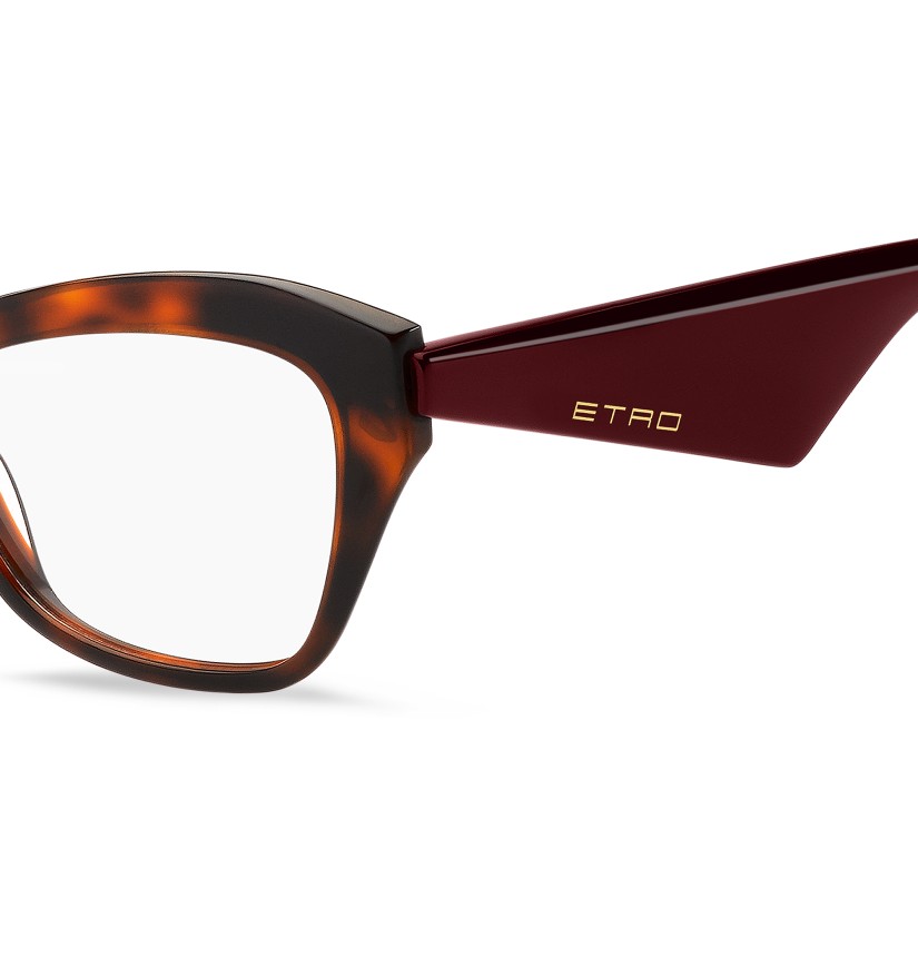 Playful, dynamic and rebellious, the "ETRO Tailoring" eyewear range returns with a renewed edge. These optical glasses explore the collection's theme with their generous volumes and sinuous shapes. Crafted with expert precision from ultra-light acetate, the softly curved profile is complemented by the vintage-inspired triangular temples. The brand's iconic end tips and subtle logo lettering transcend seasons and trends.
