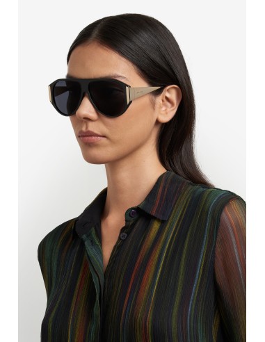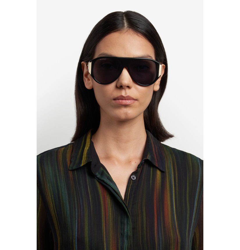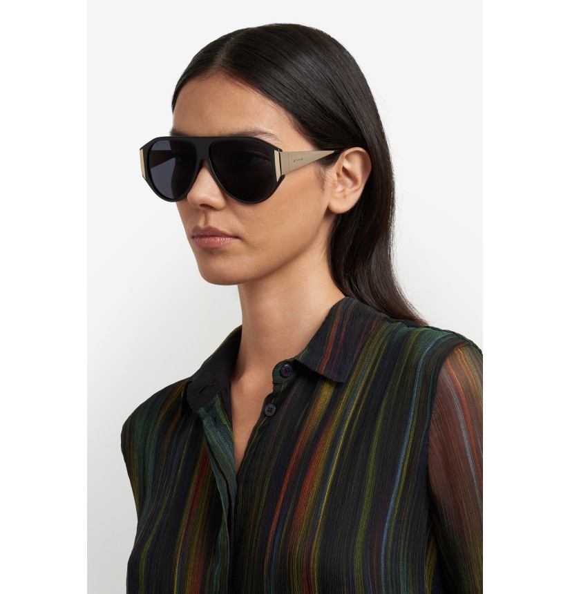 Supersized shapes and precise construction take centre stage in ETRO's "New Tailoring" eyewear line. Exuding modern elegance, these sunglasses combine a softly curved acetate frame with a sleek flat top and enveloping metal temples – subtly visible from the front for an eye-catching effect. ETRO's iconic end tips and distinctive logo details round off this disruptive design, available in a range of unexpected colour combinations.