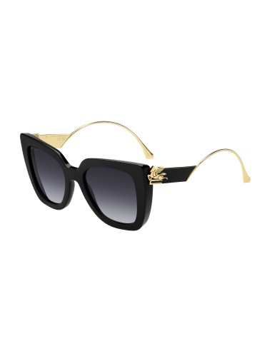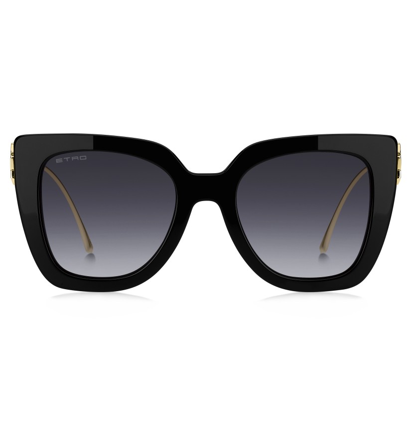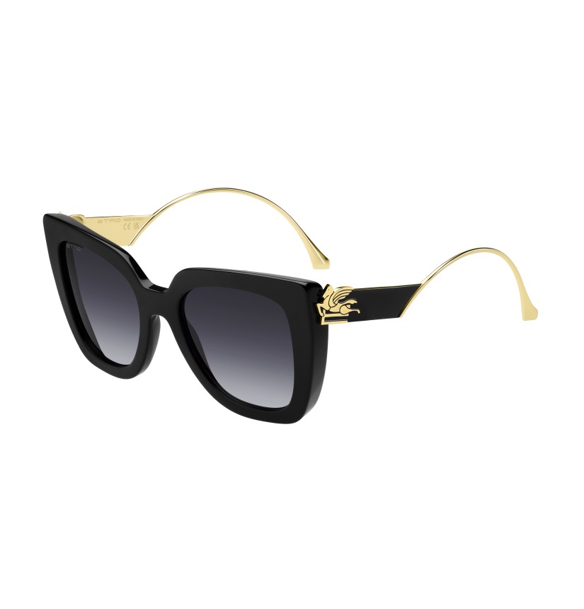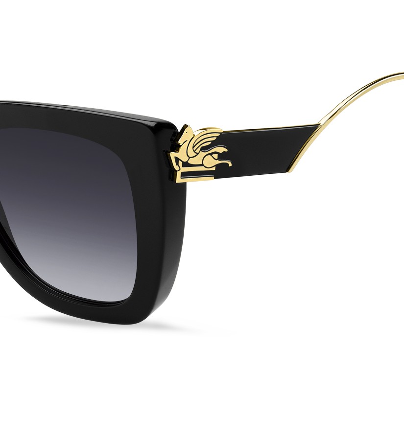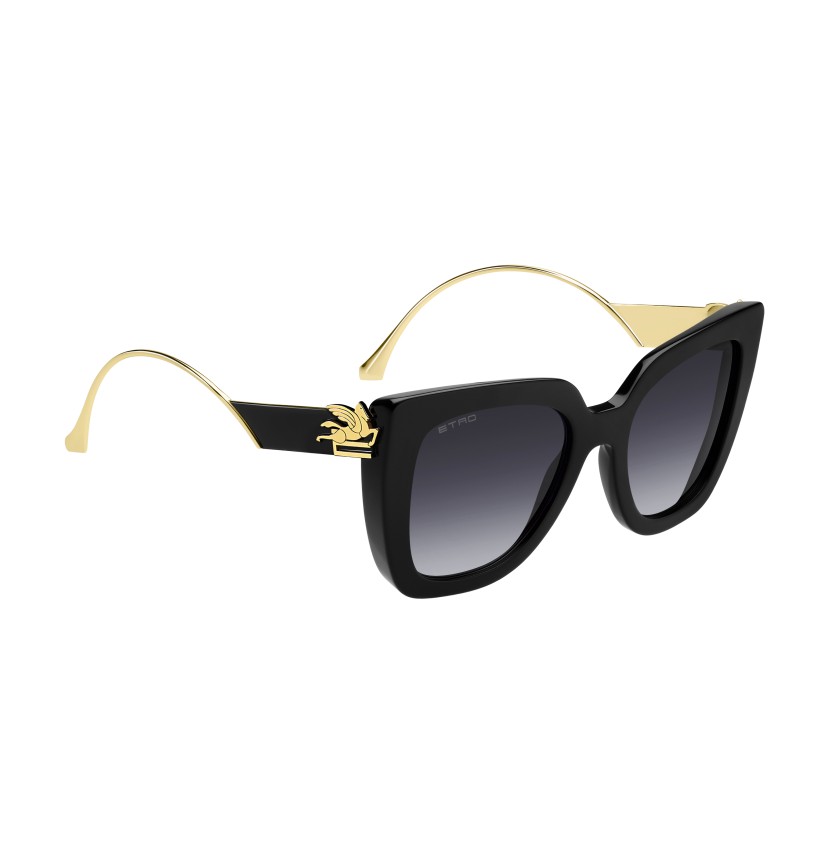 Otherworldly and futuristic themes combine in ETRO's "Bold Pegaso" eyewear line – a tribute to the mythological Pegasus. Meant to turn every look into a fashion statement, these sunglasses feature a bevelled acetate front and ultra-glamorous metal temples, decorated with ETRO's intricate floral pattern and sealed with luxurious lacquer for a jewellery-inspired finish. The iconic end tips and logo lettering on the tinted lenses lend them an unmistakable touch of elegance.