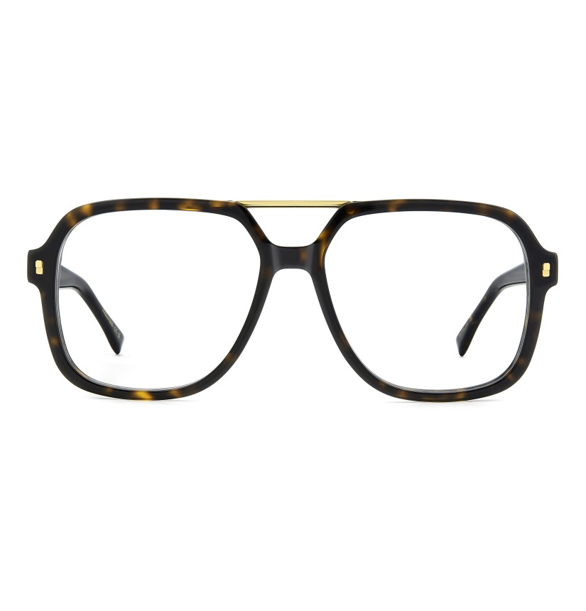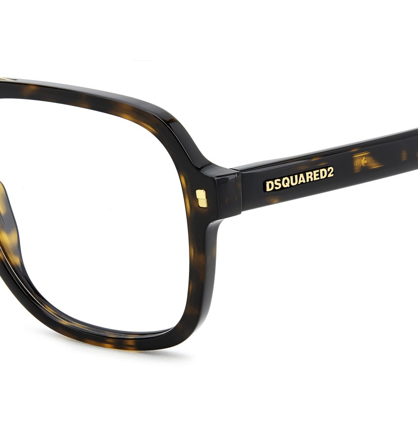Turning classic eyeglasses into a statement is the natural vocation of DSQUARED2. This acetate style is crafted into a geometric shape, with bevelled edges and moderate volumes for day-to-day use. The available colour options include a transparent version with a visible, finely patterned wire core. The brand's signatures stand out: an extended logo in relief on the outside of both temples and a metal plaque with the ‘DSQUARED2 Ceresio 9 – Milano’ inscription on the inside of one temple.