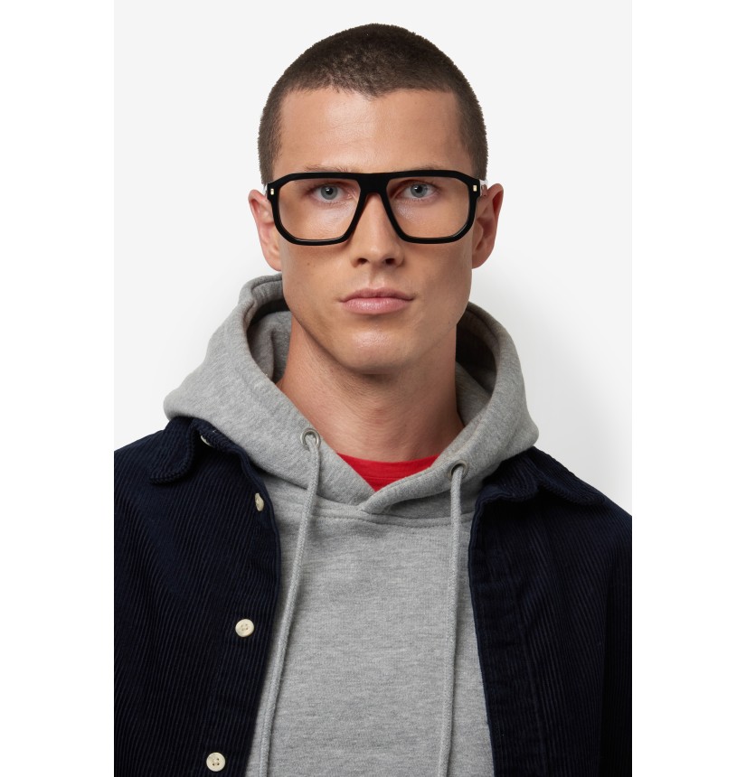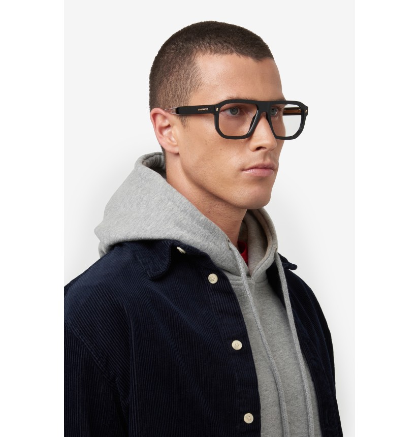 Turning classic eyeglasses into a statement is the natural vocation of DSQUARED2. This acetate style is crafted into a geometric shape, with bevelled edges and moderate volumes for day-to-day use. The available colour options include a transparent version with a visible, finely patterned wire core. The brand's signatures stand out: an extended logo in relief on the outside of both temples and a metal plaque with the ‘DSQUARED2 Ceresio 9 – Milano’ inscription on the inside of one temple.