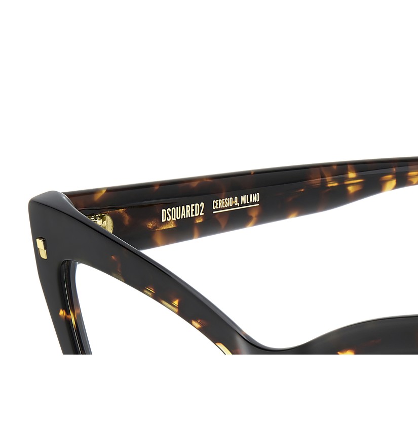 These DSQUARED2 optical glasses are made for fashion-forward women with eclectic style. In acetate, the timeless cat eye shape exudes unparalleled femininity. But there’s a surprise in store: the bold front has been carved out on the inside for lighter wearability. Whether in best-selling colours or the new two-tone multi-layer version, these glasses are decorated by the brand's original square rivets on the front and the metal D2 logo in relief on the sides.