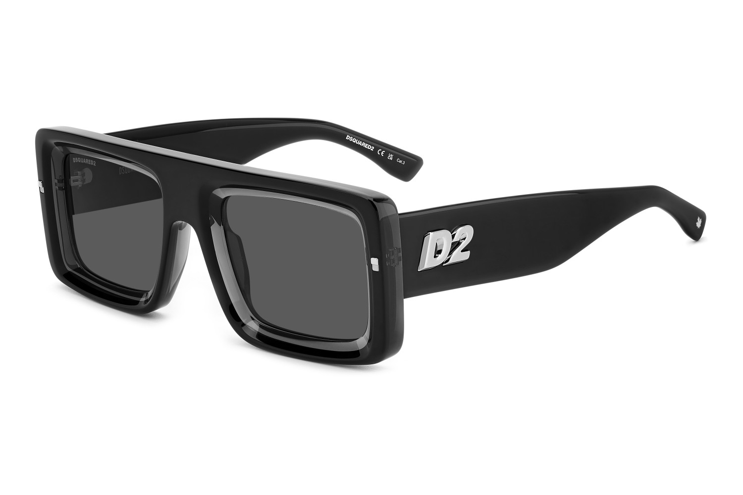 The fearless personality of these DSQUARED2 sunglasses is sure to win over fans of the brand. It’s no accident that their decisive shapes are authentic best-sellers. Boxy and decidedly bold, the acetate structure has been bevelled around the lenses, for an extra dose of character. Whether plain black or multi-layer, all versions are trimmed by the ‘D2’ logo with a sleek 3D effect. This style can hold prescription lenses.