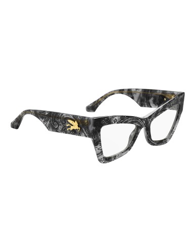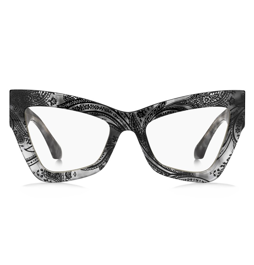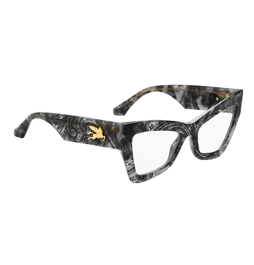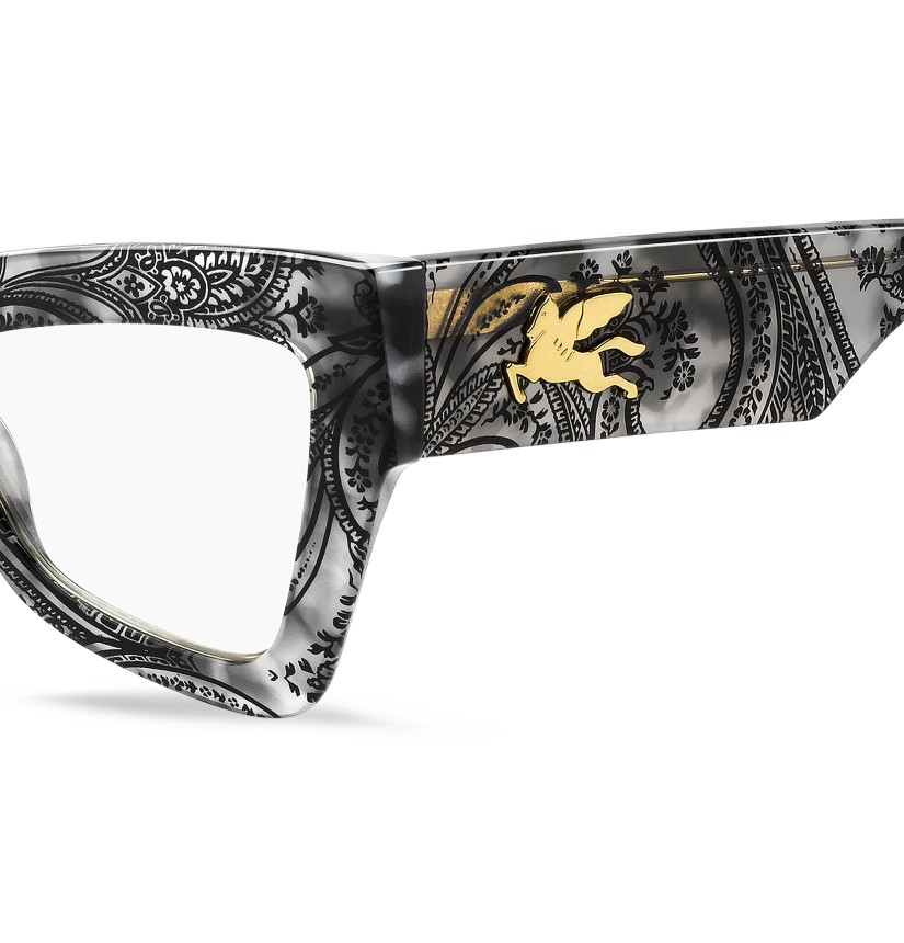 A powerful fashion statement – these optical glasses embrace the mood of ETRO's latest runway show. The striking angular shape is crafted from premium acetate, available in black and in the distinctive Paisley pattern. Notice the innovative construction of the temples, combining a subtle milled effect with a one-piece metal trim depicting the mythical Pegasus. The iconic end tips complete this daring pair.