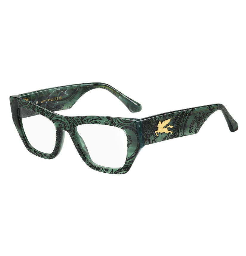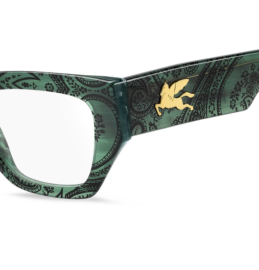 Refined and quintessentially ETRO, these optical glasses make a stunning statement with their bold shape, exquisite construction and the precious Pegaso detail that catches the light at all angles. They're made from premium acetate developed exclusively for the brand, finished using a milling process, and available in classic black, ETRO's burgundy, and Paisley-patterned variations that give fresh energy to heritage codes.