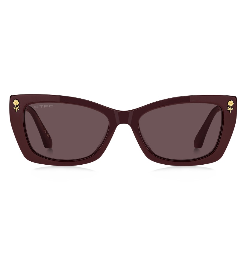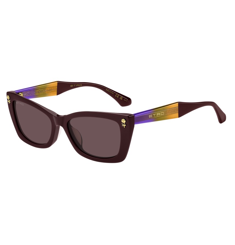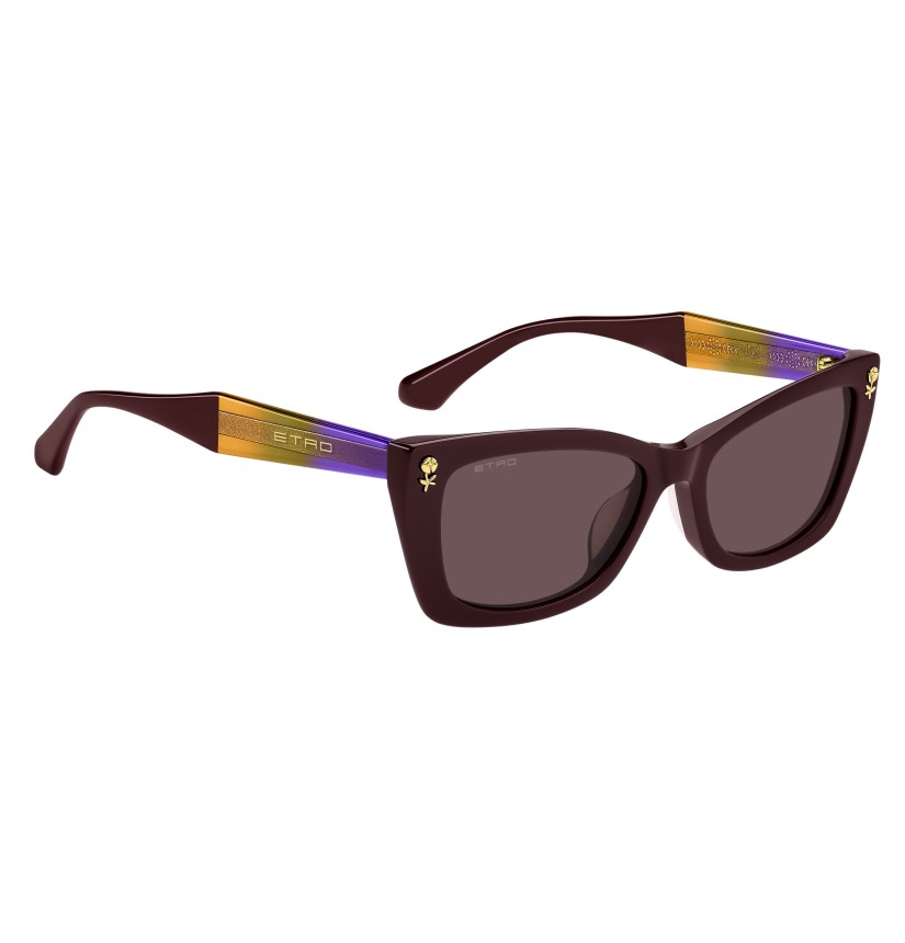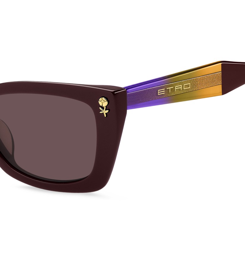 Evolving ETRO's "Colour Stripes" story for the new season, these sunglasses are designed to be seen. The bold acetate frame is bevelled around the front for lightness and paired with geometric temples in a sheer ombré palette that allows the graphic metal wirecore to peek through. Notice the floral details inspired by intricate embroidery techniques, the famous ETRO logo and the signature temple tips. The colour palette blends classic tones with intriguing transparencies to striking effect.