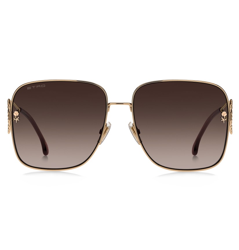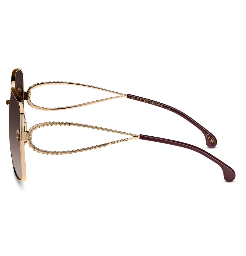 An ode to creative freedom and artistic experimentation, these sunglasses draw inspiration from ETRO's jewellery collection. The sleek metal silhouette sees an innovative chiselling technique applied to the sculptural temples to create an enhanced three-dimensional effect. The shape of the temples recalls the brand's signature Paisley motif, beautifully rounded and extremely lightweight for everyday comfort. ETRO's intricate floral detail and glistening logo complete this exceptional design, as fashionable as it is functional.