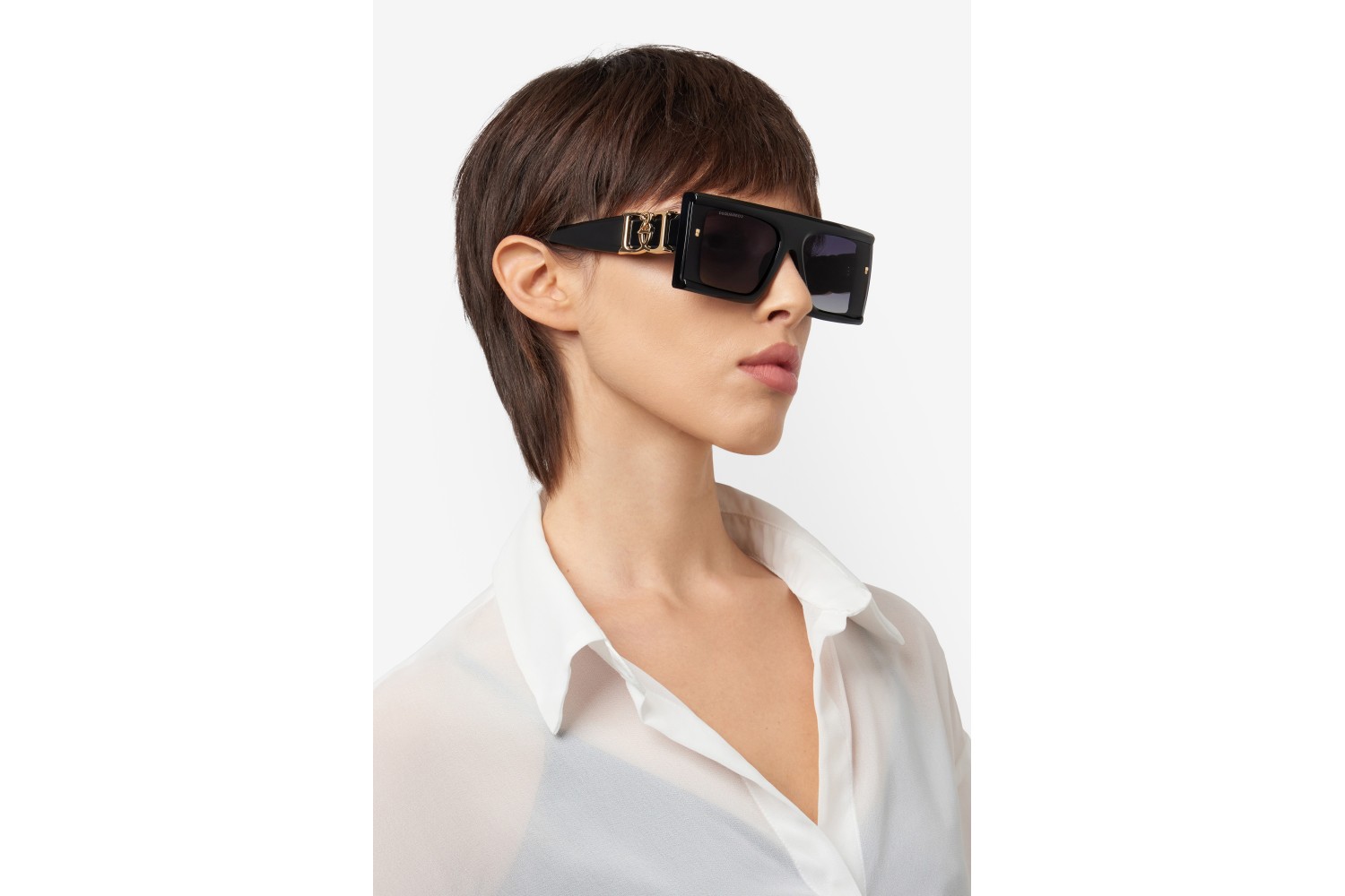 These DSQUARED2 sunglasses for women are finely detailed and sculpted. The frames are a masterpiece of design: decisively bold, they feature full volumes, lenses which are left open at the sides, and square rivets in metal. The new intertwined ‘D’ logo embraces the temples, set like a metal jewel onto their surface. This style comes in a heat-moulded version composed of two layers of acetate with contrast finishes.