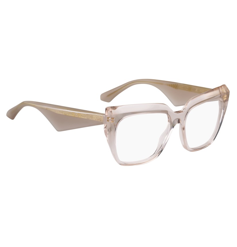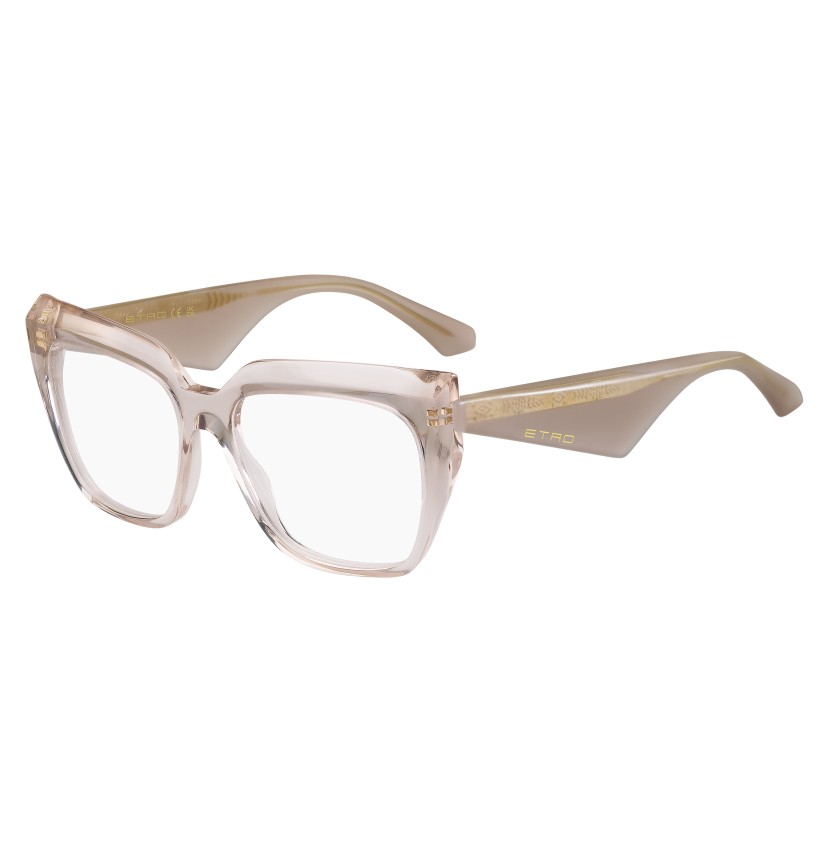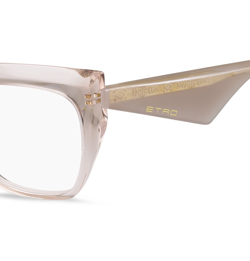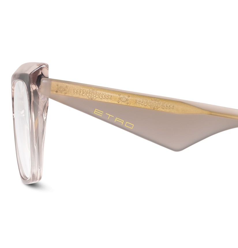 Reinterpreting vintage codes with sculptural precision, the "ETRO Tailoring" eyewear edit brings a new attitude to classic shapes. These optical glasses are defined by bold acetate volumes and contrasting geometries with bevelled profiles for lightweight comfort. The triangular temples are finished with an oblique inlet ETRO logo and geometric end tips. A colour palette of neutral hues and vibrant motifs complements the line's sharp, tailored character.