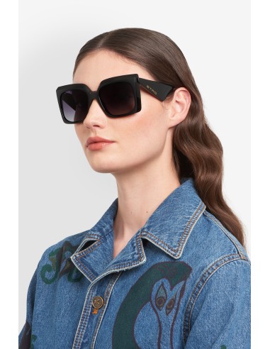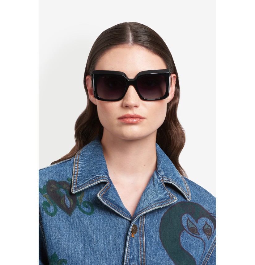 Reinterpreting vintage codes with sculptural precision, the "ETRO Tailoring" eyewear edit brings a new attitude to classic shapes. These sunglasses are defined by bold acetate volumes and contrasting geometries with bevelled profiles for lightweight comfort. The triangular temples are finished with an oblique inlet ETRO logo and geometric end tips. A colour palette of neutral hues and vibrant motifs complements the line's sharp, tailored character.