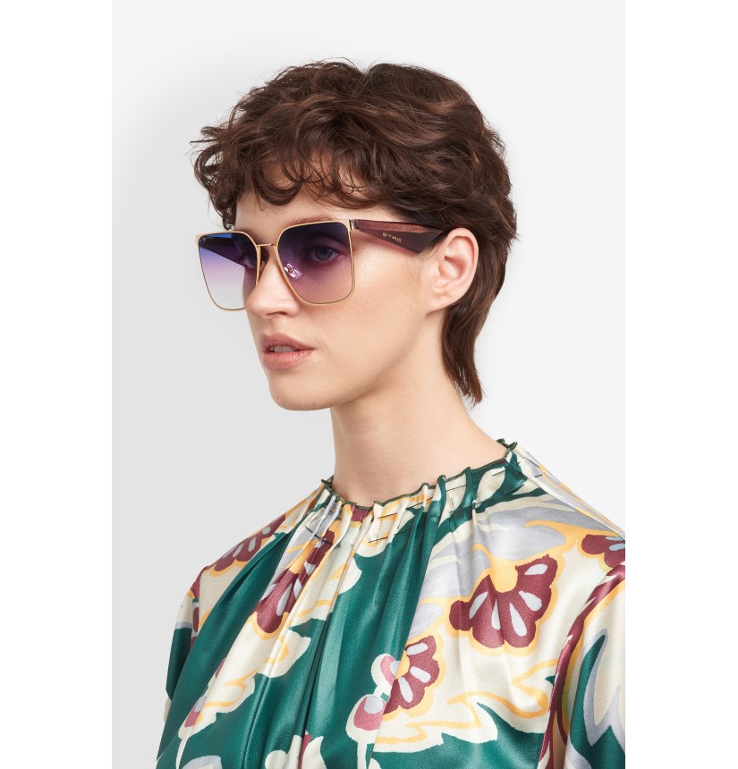 Effortlessly balancing geometry and detail, the "Combi Tailoring" sunglasses pair functionality with refined style. The style combines a metal front with vintage-inspired acetate temples in a sculptural silhouette elevated by a triangular shape. A diagonal inlet logo and a laser-etched lettering on the tinted lenses impart an iconic ETRO touch, while the sculpted end tips and adjustable nose pads ensure practical comfort.