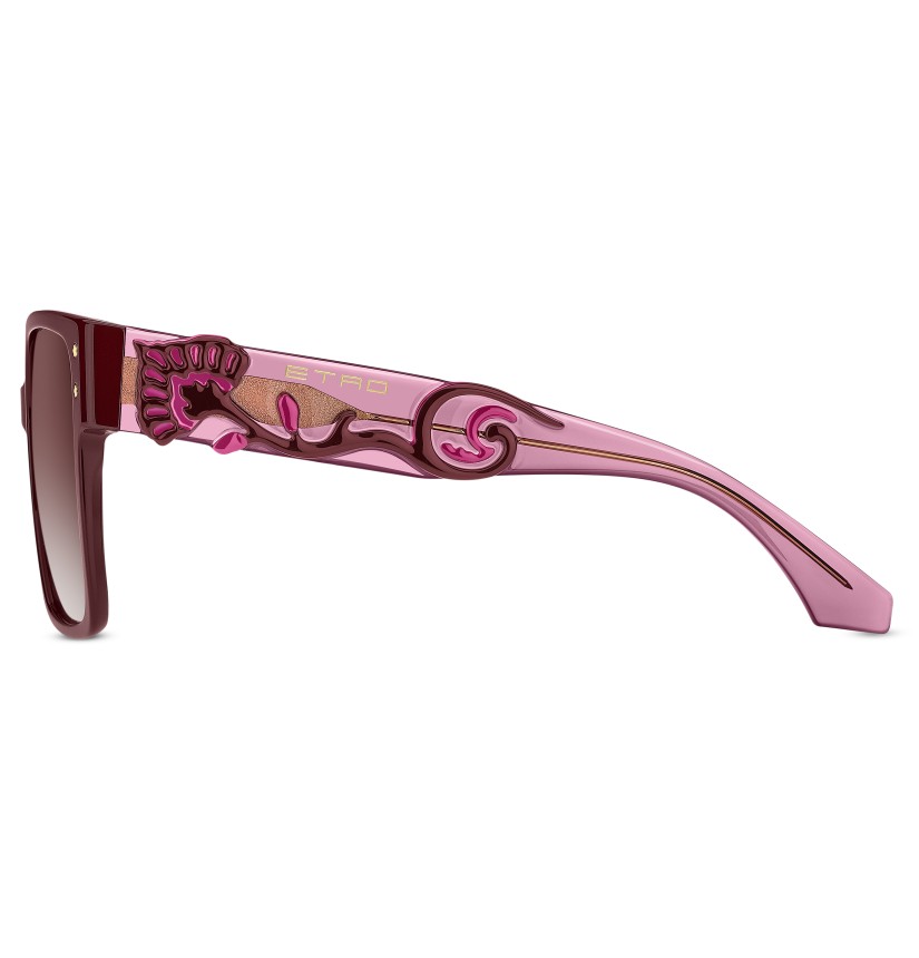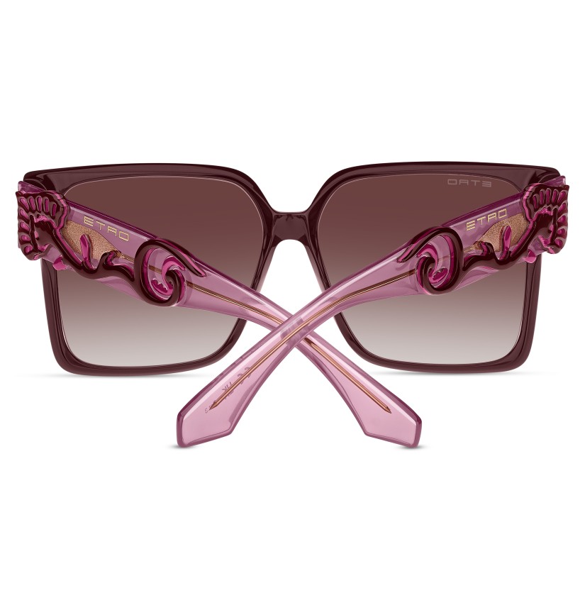 Channelling ETRO's innovative spirit rooted in refined craftsmanship, the "Etroblossom" optical glasses are at once elegant and uncompromising. Premium acetate rims frame a comfortable silhouette accented by flower-shaped screws on both sides. The tri-layer acetate temples are embellished with high-relief floral motifs in a nod to runway fabrics, while a visible wire-core and inlet logo enhance the transparent design. The geometrically sculpted end tips finish the design with a signature ETRO detail.