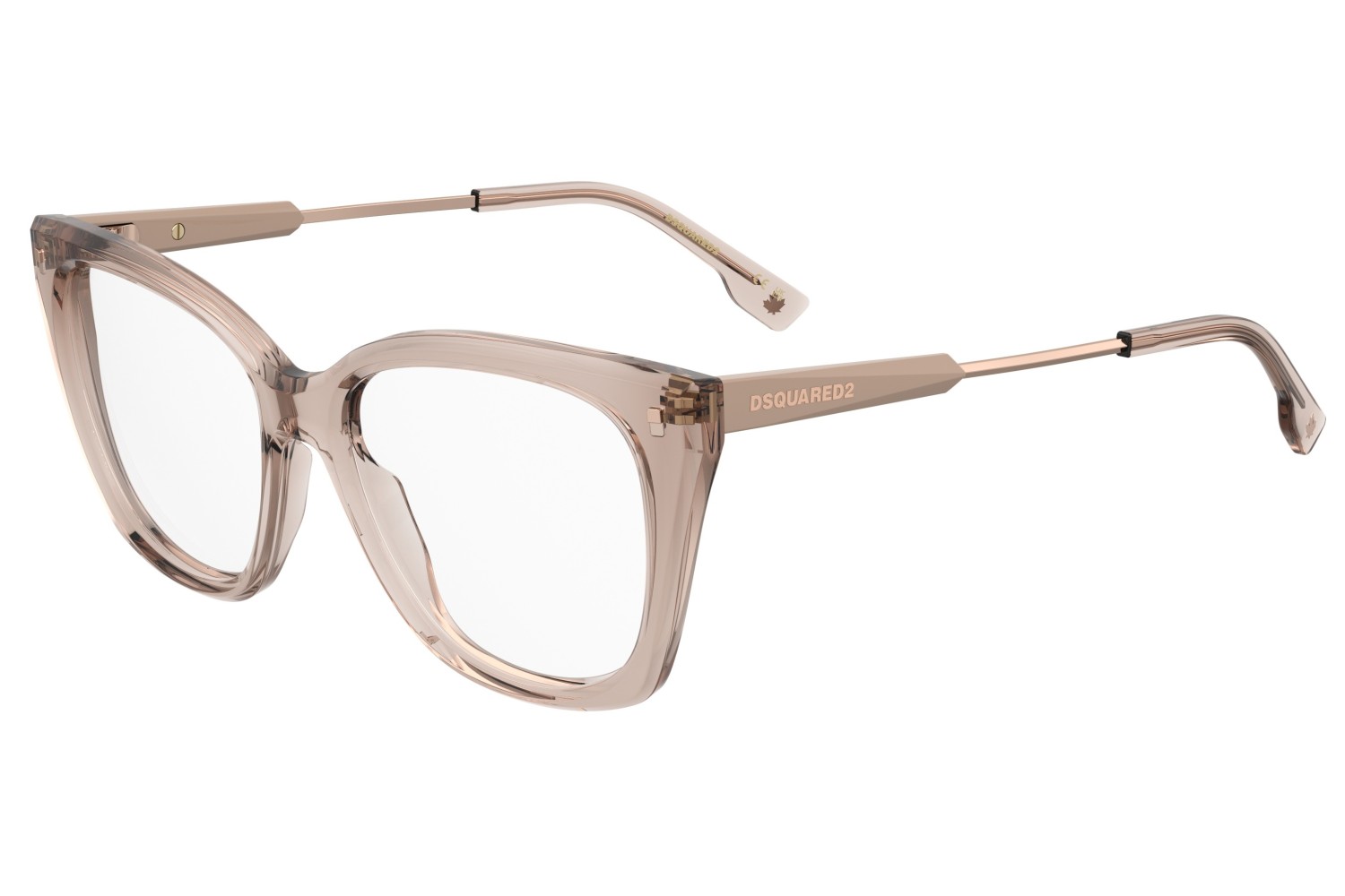 The allure of DSQUARED2 optical glasses for women is magnetic. This style has an ever-intriguing, soft and feminine cat eye shape. The combination temples are nothing short of gorgeous, with slim and essential lines in metal: one of the most-popular concepts seen on DSQUARED2 eyewear. The brand’s signature details abound, from the iconic double rivets to the inlay logo on the temple and the maple leaf on the end tips.