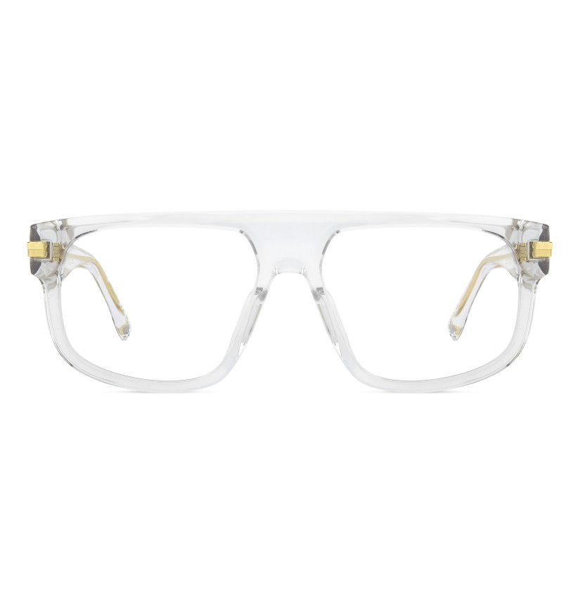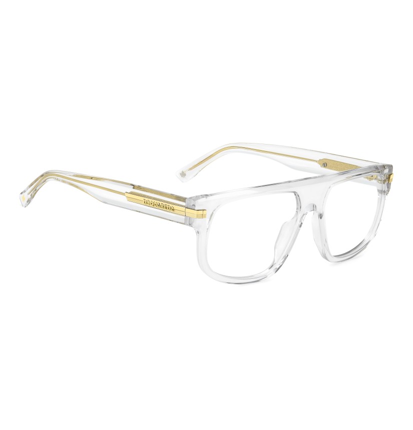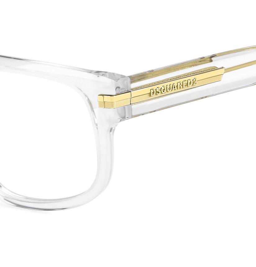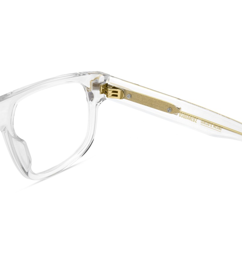 The bold character of DSQUARED2 stands out in these acetate optical glasses. The proportions of the front are a statement: edgy and bevelled along the top for a premium look that's sure to get noticed. The iconic metal rivets extend into a metal element on the temples, finished with an interplay of shiny-matt surfaces and a DSQUARED2 logo in relief. Whether in black or transparent, these glasses are the very essence of cool.