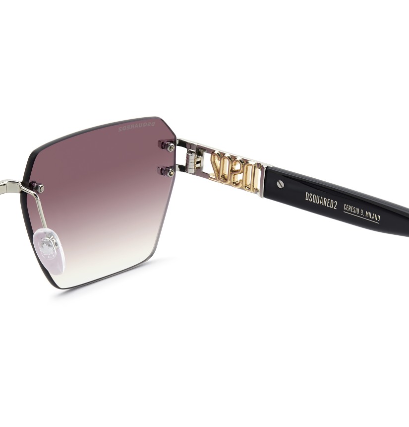 DSQUARED2 has brought a fresh twist to its best-selling sunglasses. The rimless shape of this style is iconic, one of the brand's most recognisable and an all-time best seller. A cut-out DSQ2 logo embellishes the temples, which are secured directly to the lens via double screws concealed by metal arms inspired by the staggered rivets of DSQUARED2. Available in multiple colourways, the version with a dual gold and palladium finish is notable, and the one with an all-over D2 print on the lenses is unforgettable.