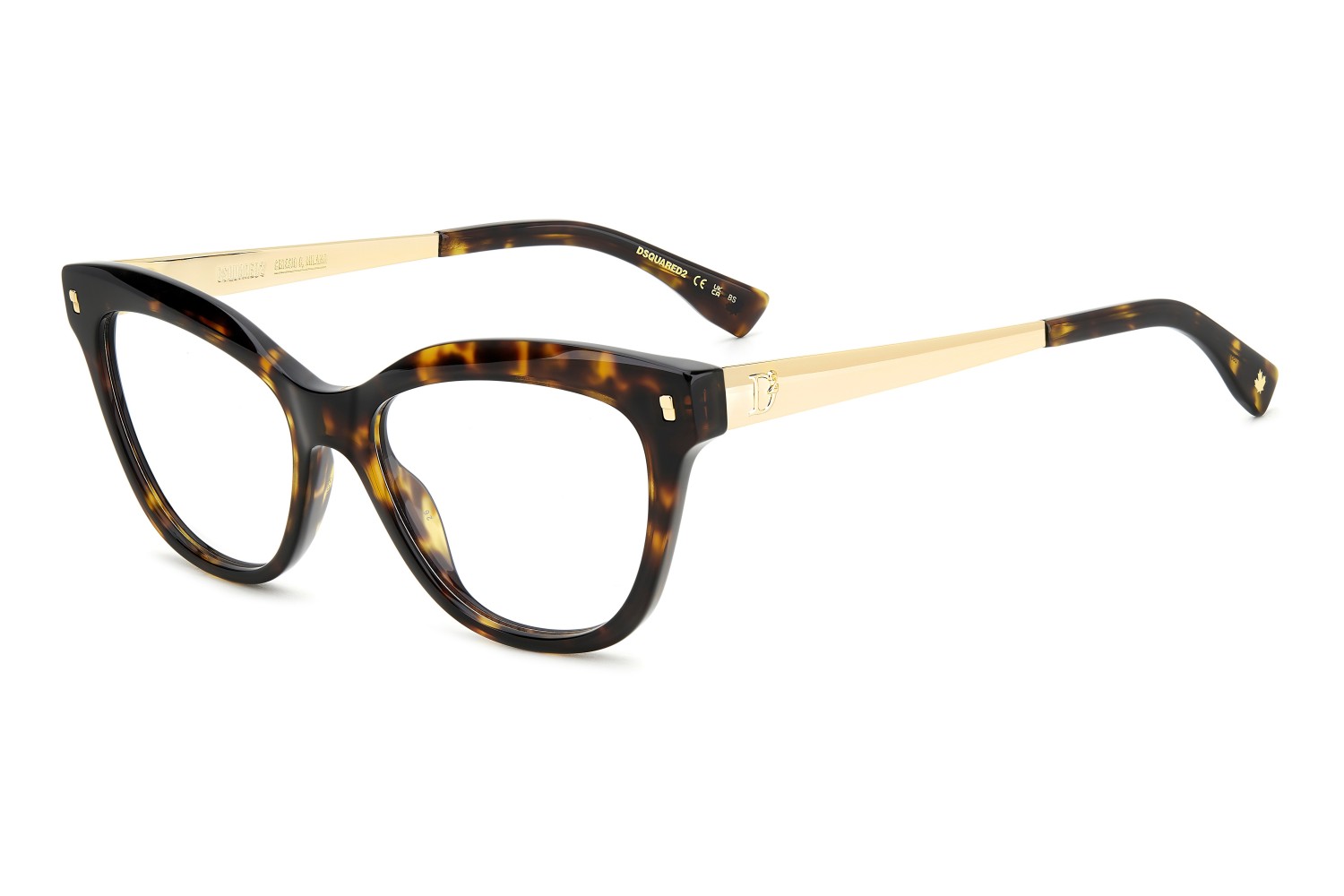 These DSQUARED2 eyeglasses were designed to complete every look with a touch of bold femininity. The prominent, multi-faceted cat-eye front frames the face in acetate, decorated by distinct rivets. Made of metal, the temples are trimmed by the D2 logo, and the CERESIO 9, MILANO inscription on the inside. The fit is especially comfortable thanks to the acetate end tips, which are decorated by the brand's symbol: the maple leaf.