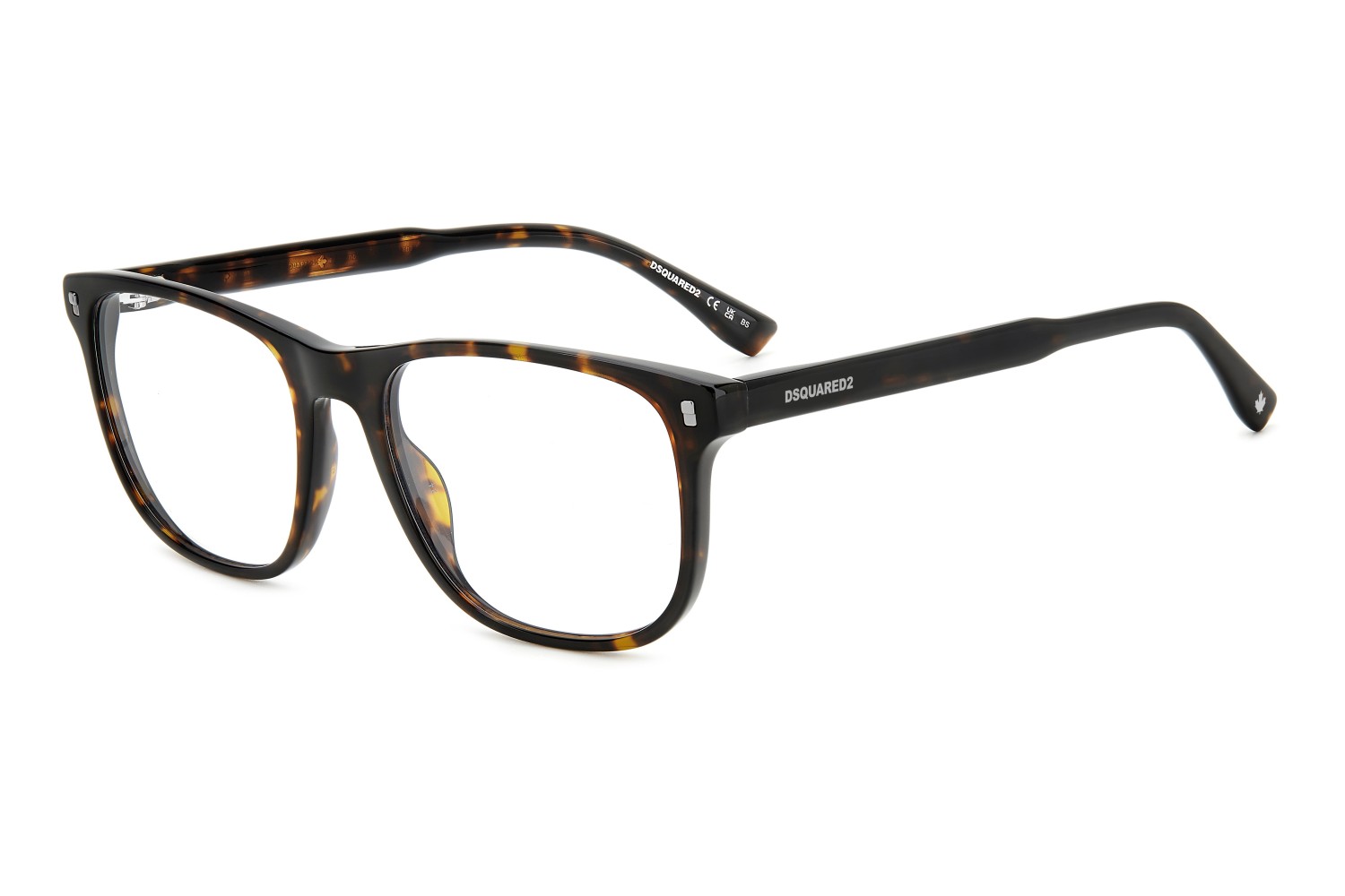 These semi-bold eyeglasses have been given a fresh twist thanks to the lighter proportions of the new acetate front. The metal core with the engraved DSQUARED2 'tape' can be seen through the original temples. The brand has also signed these men's glasses with an injected logo on the outer temple near the hinges, and with the must-have maple leaf on the comfortable end tips: distinctive features that convey truly unique design.