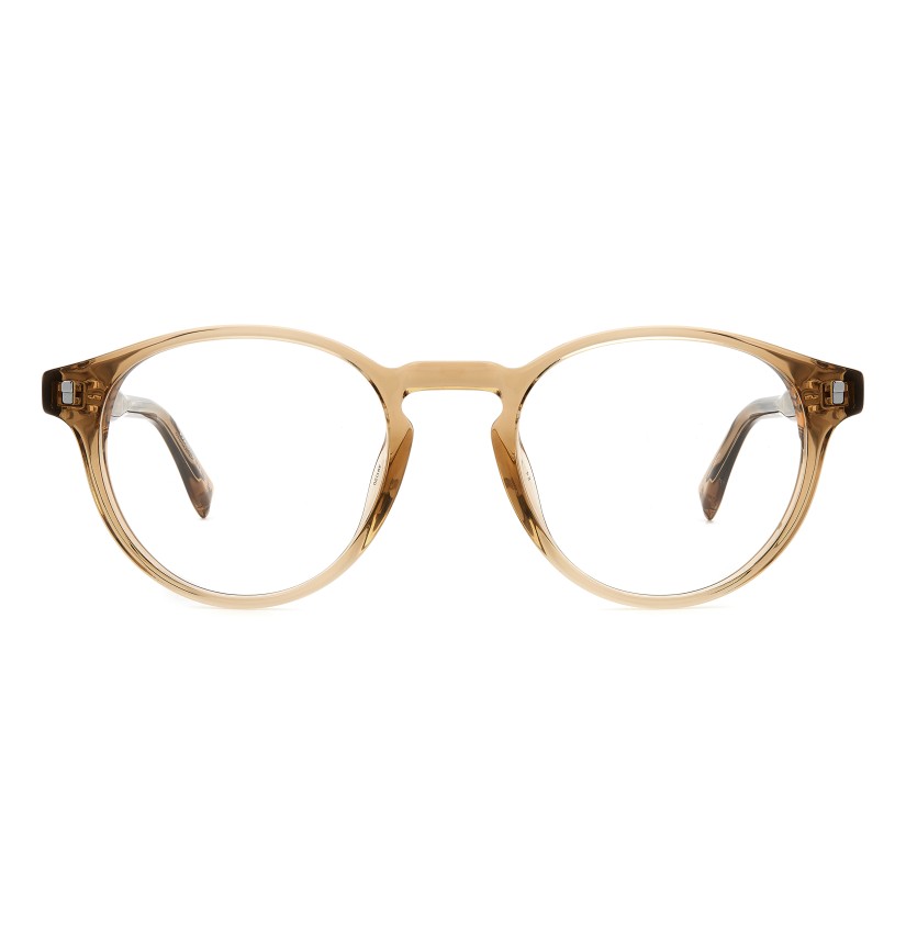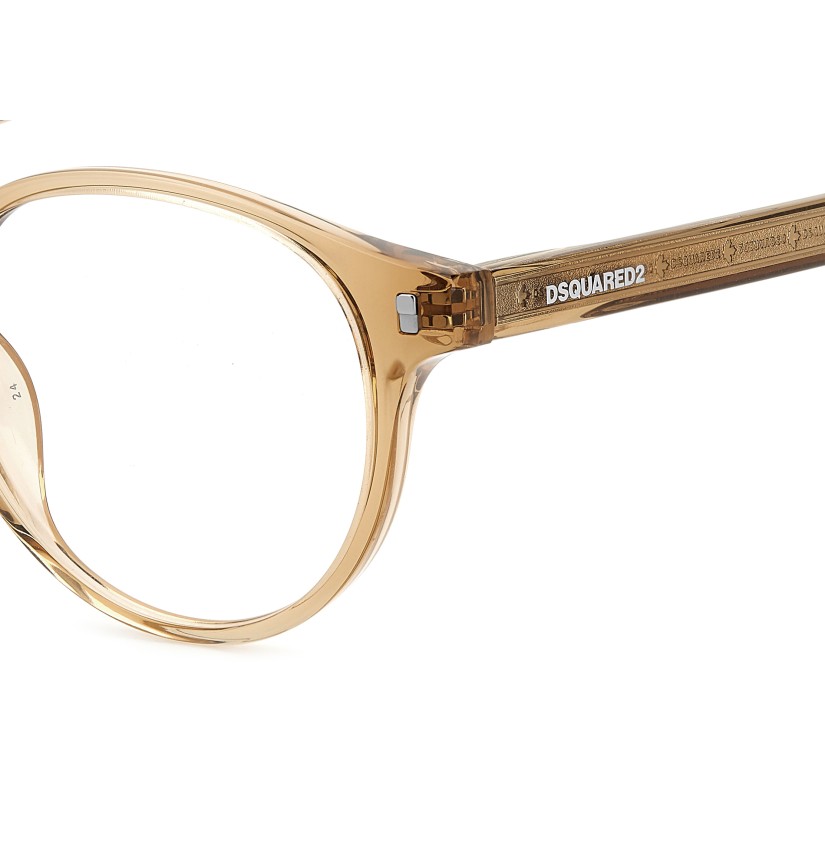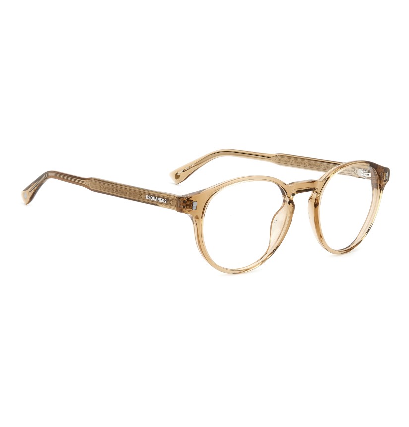 These semi-bold eyeglasses have been given a fresh twist thanks to the lighter proportions of the new acetate front. The metal core with the engraved DSQUARED2 'tape' can be seen through the original temples. The brand has also signed these men's glasses with an injected logo on the outer temple near the hinges, and with the must-have maple leaf on the comfortable end tips: distinctive features that convey truly unique design.