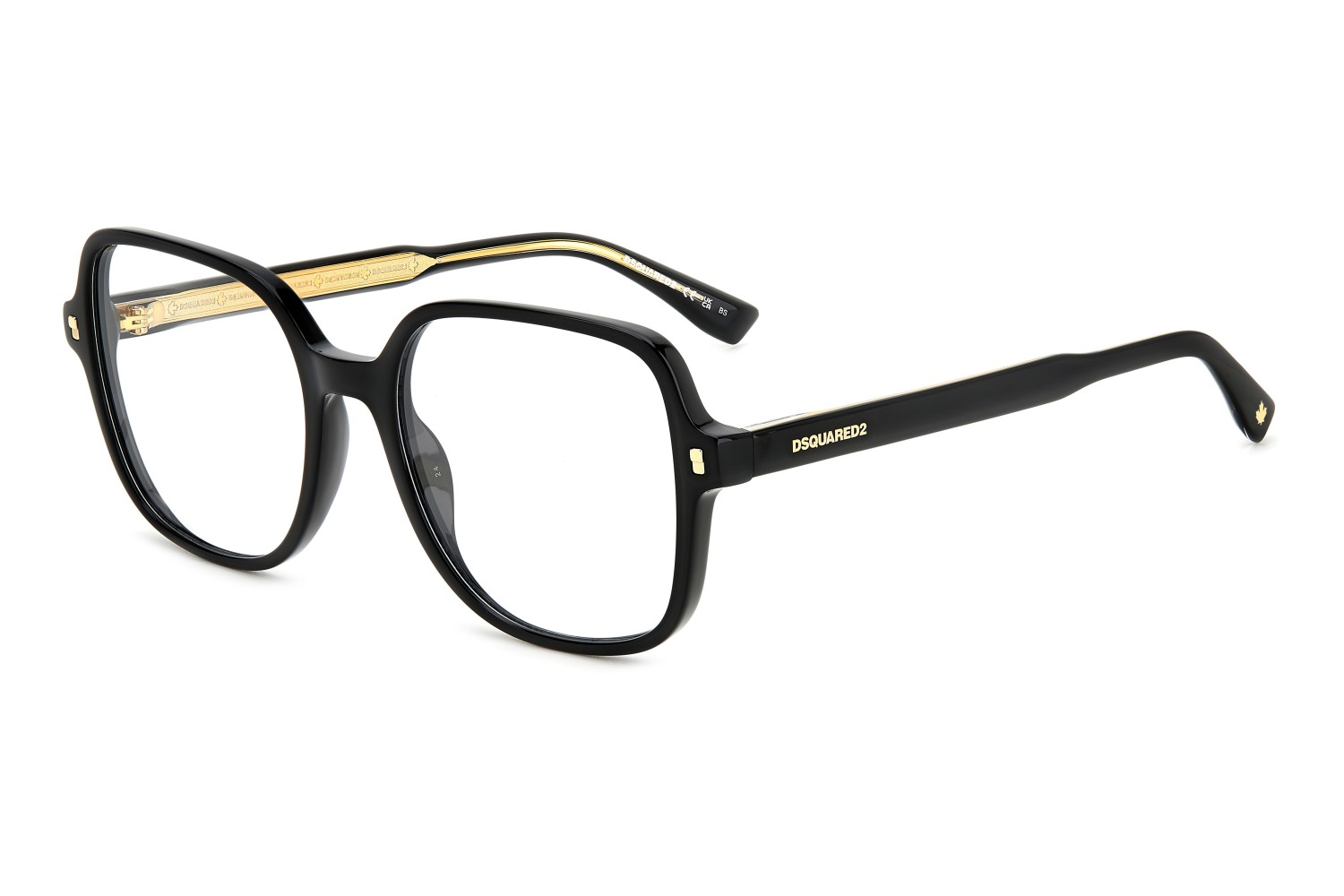 These semi-bold eyeglasses have been given a fresh twist thanks to the lighter proportions of the new acetate front. The metal core with the engraved DSQUARED2 'tape' can be seen through the original temples. The brand has also signed these women’s glasses with an injected logo on the outer temple near the hinges, and with the must-have maple leaf on the comfortable end tips: distinctive features that convey truly unique design.