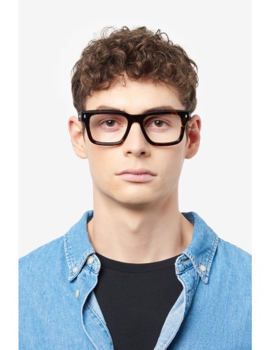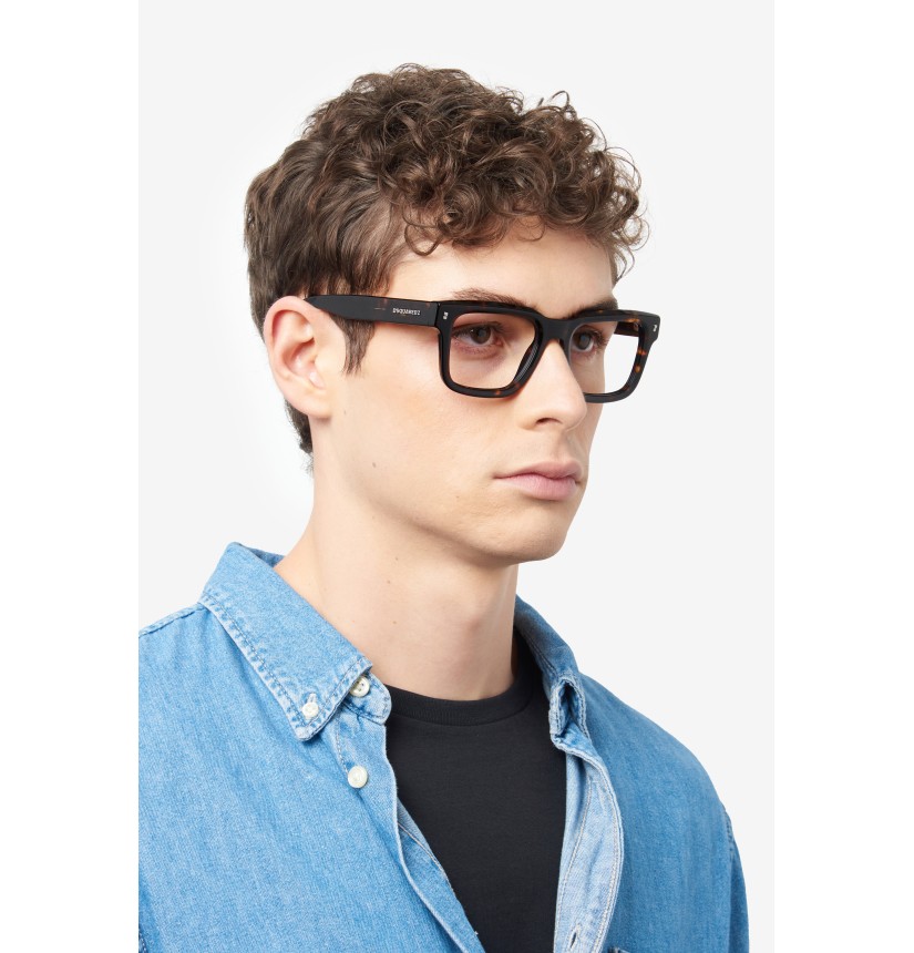 These men's eyeglasses have bold temples trimmed by a raised DSQUARED2 emblem and the CERESIO 9, MILANO inscription, plus the must-have maple leaf on the end tips. Their exclusive shape was inspired by the brand's accessories, and is enhanced by the bold acetate front with iconic metal rivets, giving these glasses plenty of personality.