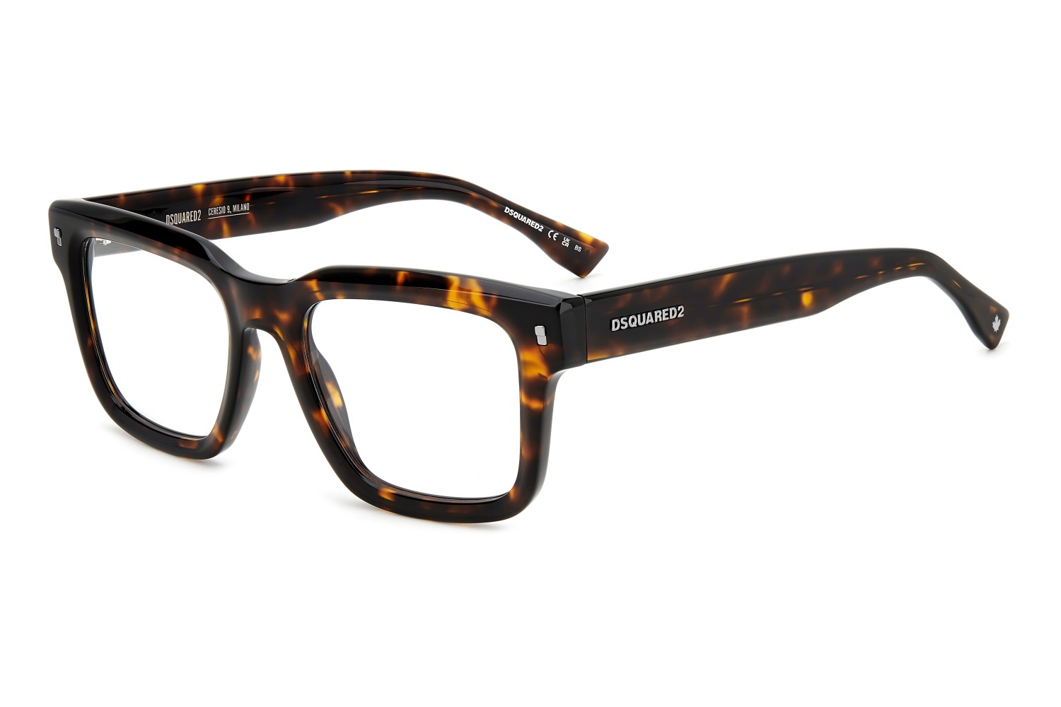 These men's eyeglasses have bold temples trimmed by a raised DSQUARED2 emblem and the CERESIO 9, MILANO inscription, plus the must-have maple leaf on the end tips. Their exclusive shape was inspired by the brand's accessories, and is enhanced by the bold acetate front with iconic metal rivets, giving these glasses plenty of personality.