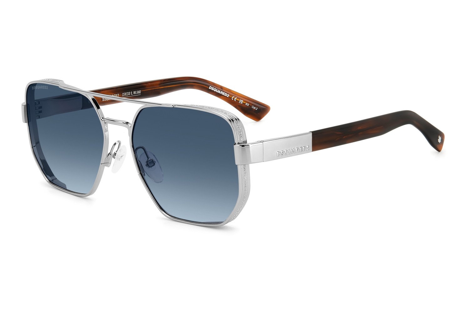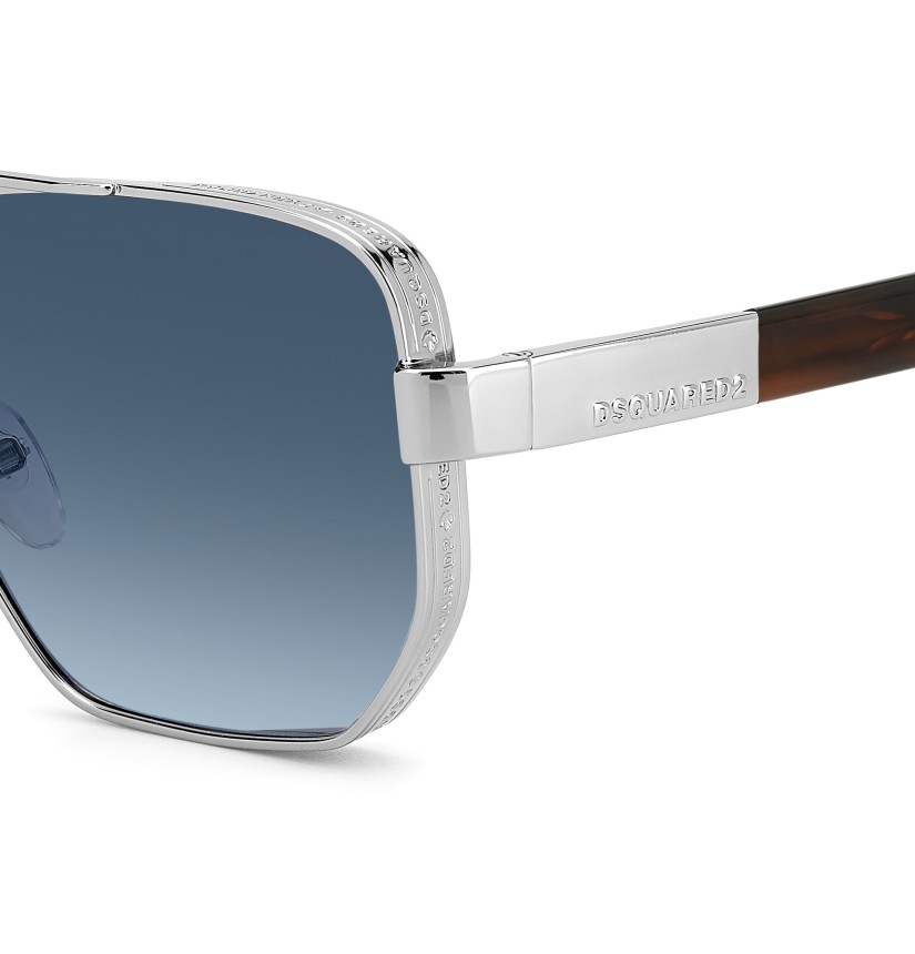 These men's DSQUARED2 sunglasses have a bold geometric front with a double bridge in metal, with adjustable nose pads embellished by a maple leaf and an original spoiler wrapped in a chiselled 'band' which repeats the brand's name. The metal temples feature an off-centre raised DSQUARED2 wordmark, while the CERESIO 9, MILANO inscription is found on the inside of the right temple. The quintessential maple leaf decorates the elongated end tips.
