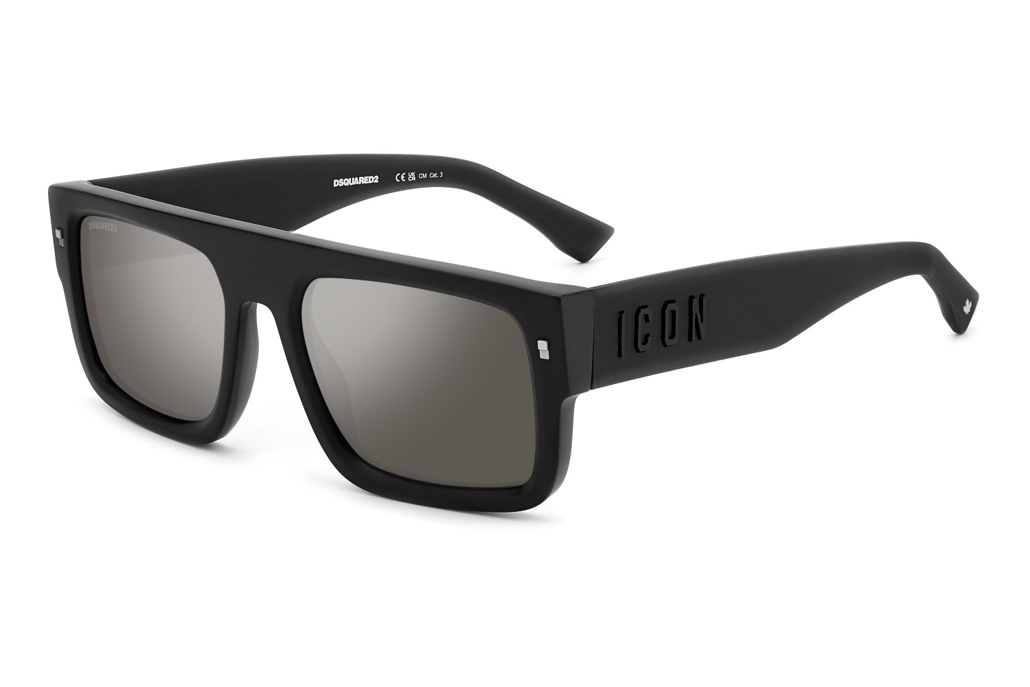 These inimitable sunglasses have become a fashion-forward icon! A laser-etched DSQUARED2 logo appears on the right sun lens, while original metal rivets set into the upper corners add extra flair. The raised silicon ‘ICON’ lettering stands out on the bold temples, which taper into end tips trimmed by the brand’s maple leaf symbol. An accessory that will impress on any occasion.