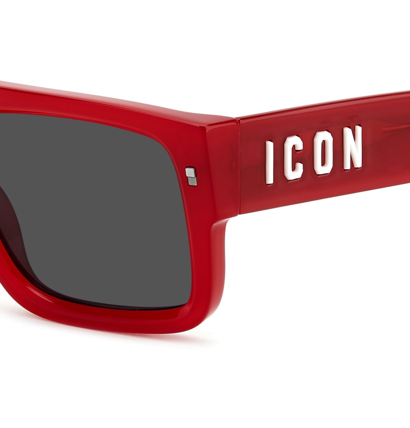 These inimitable sunglasses have become a fashion-forward icon! A laser-etched DSQUARED2 logo appears on the right sun lens, while original metal rivets set into the upper corners add extra flair. The raised silicon ‘ICON’ lettering stands out on the bold temples, which taper into end tips trimmed by the brand’s maple leaf symbol. An accessory that will impress on any occasion.
