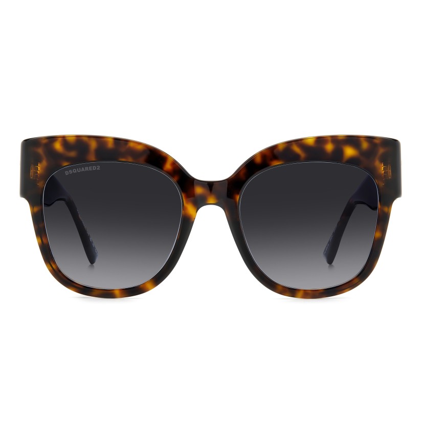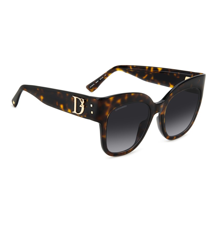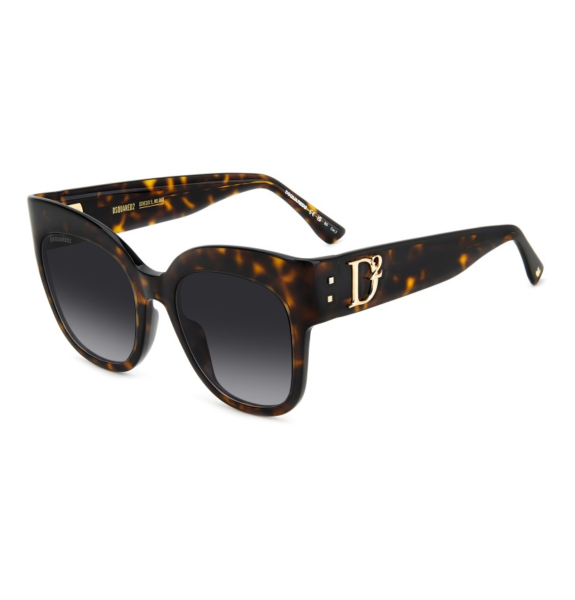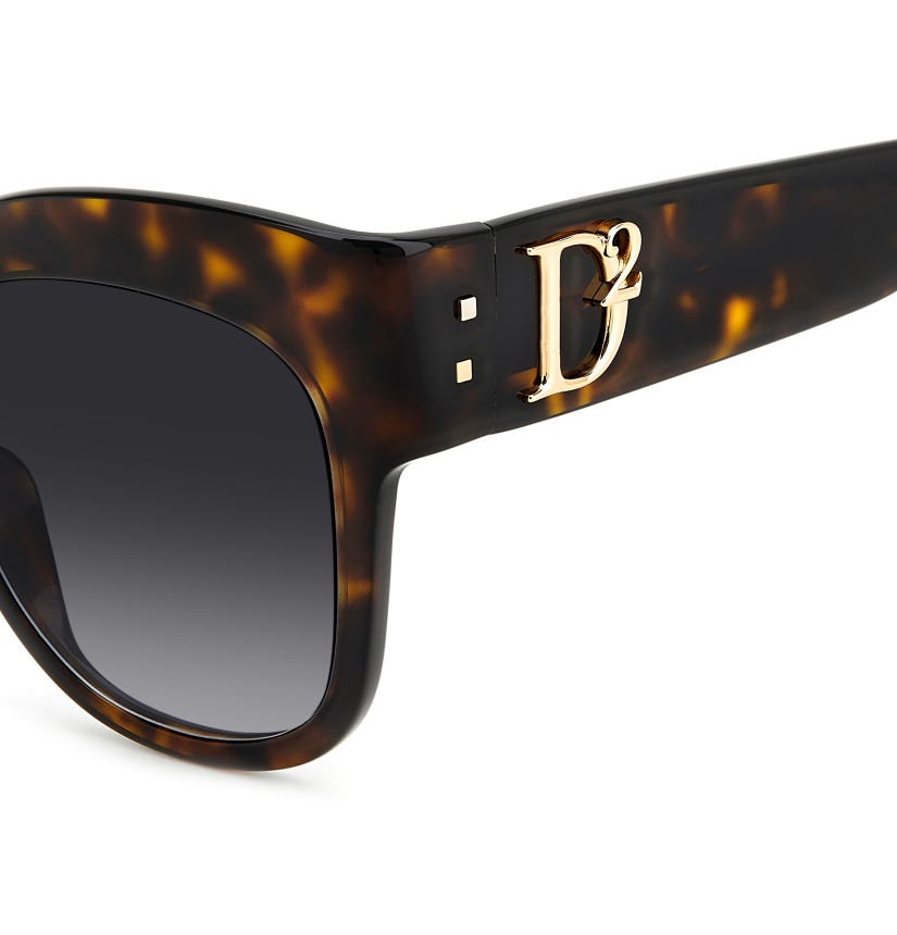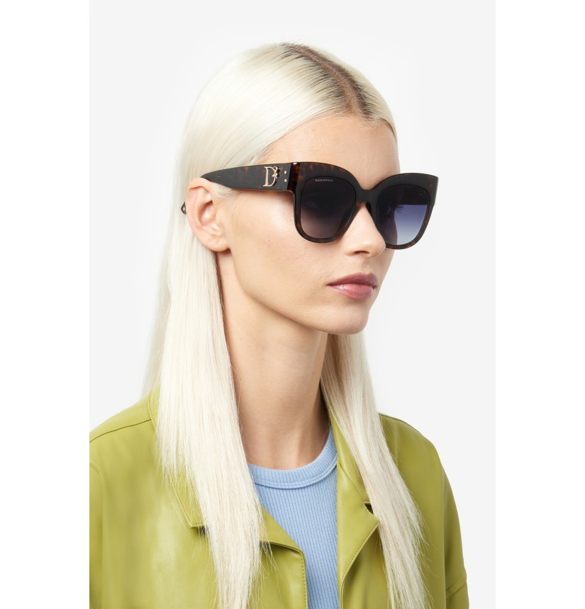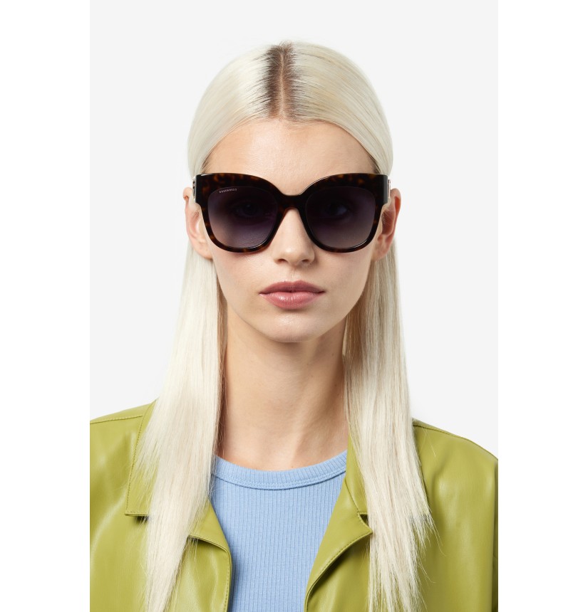 To create these unique sunglasses, DSQUARED2 has combined oversize cat-eye frames in slender acetate with subtle bezel finishing and bold temples trimmed by a macro raised D2 logo which was inspired by the brand's accessories for women. Other details bring the fashion house’s identity to the fore: two metal rivets near the hinge and the famous maple leaf on the end tips. The CERESIO 9, MILANO inscription customises the inside of the right temple, while ‘DSQUARED2’ appears on one of the sun lenses.