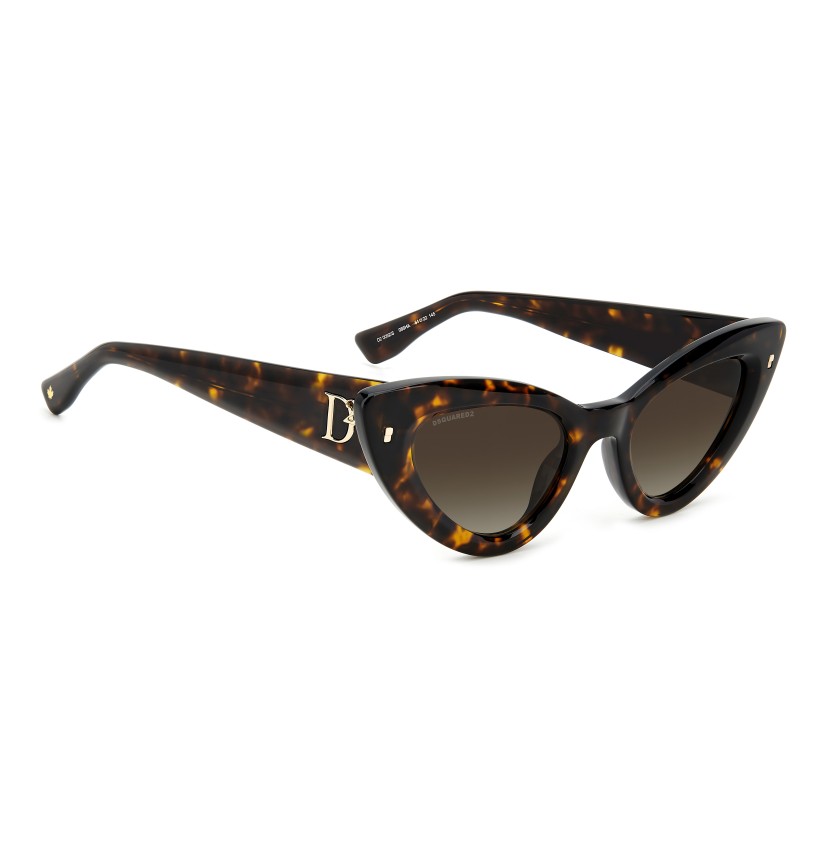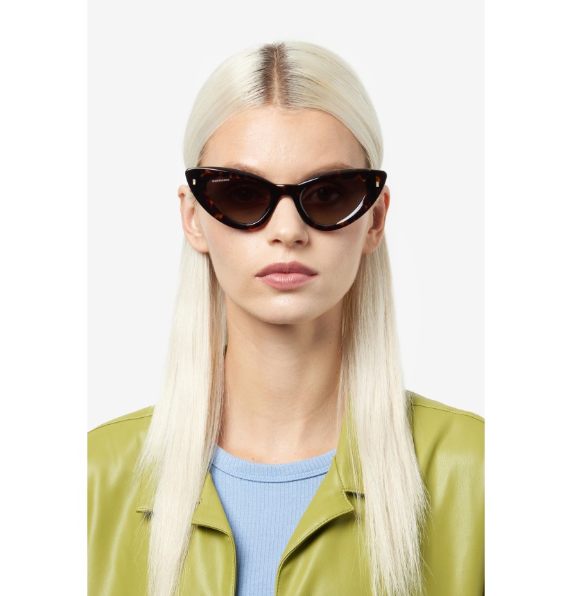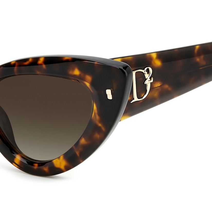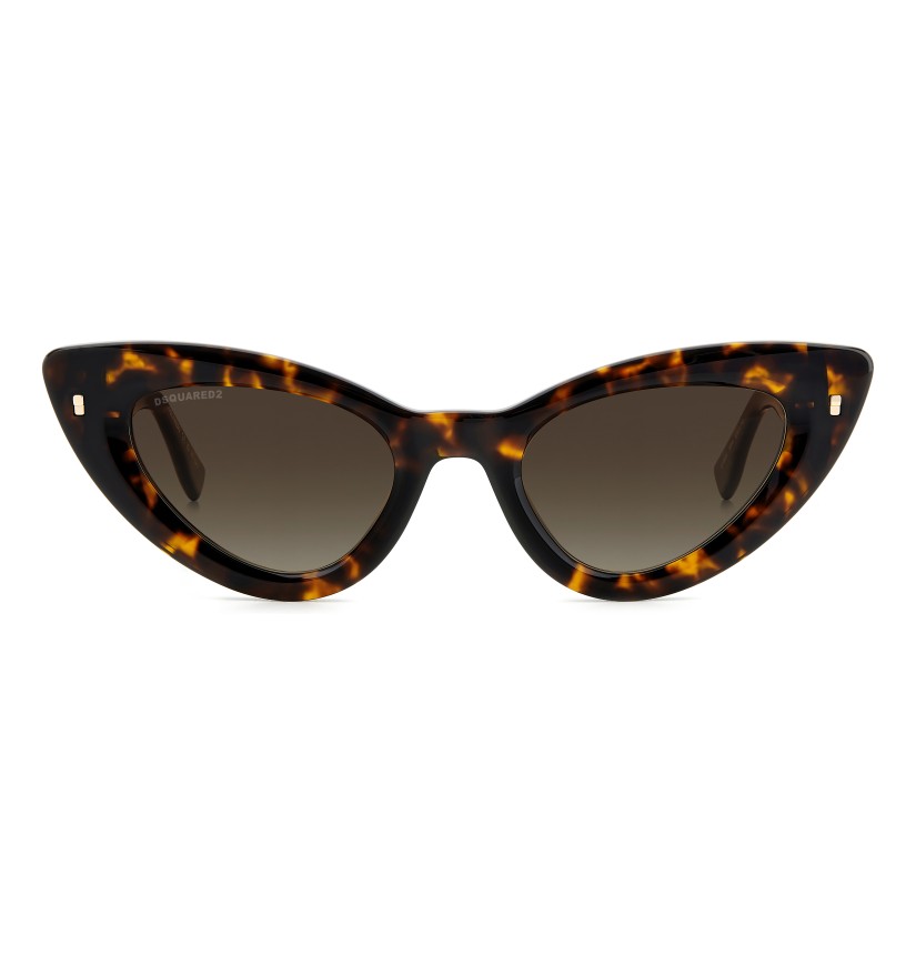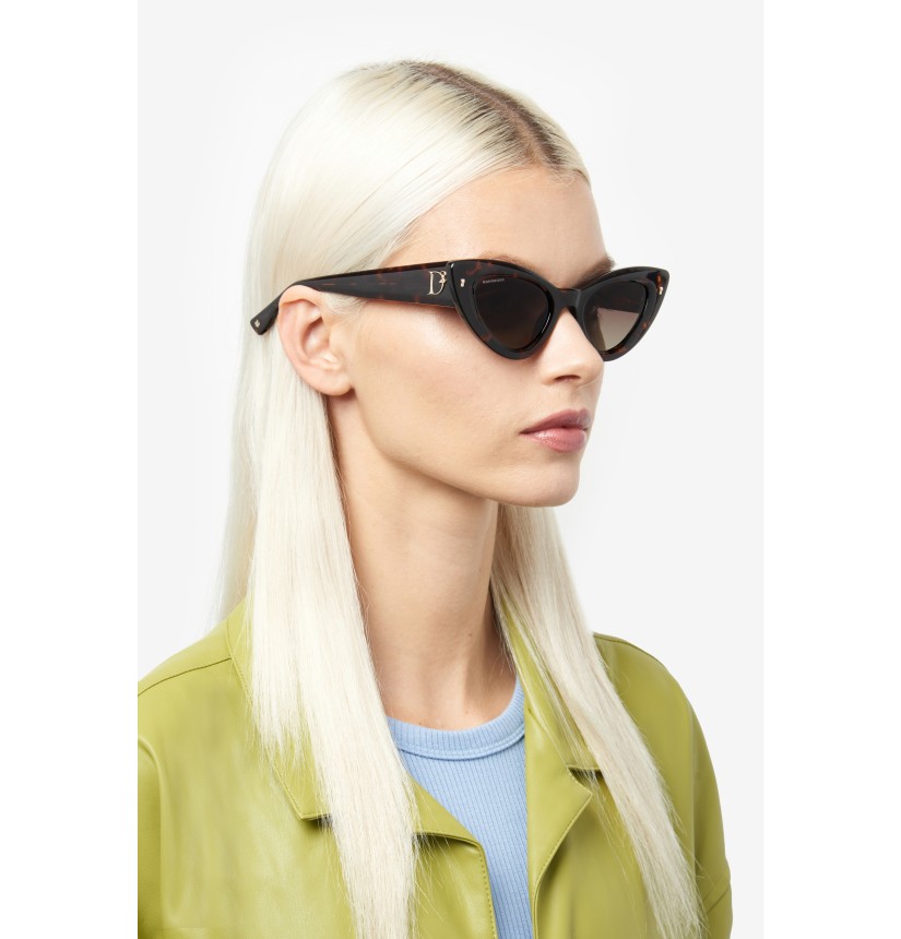 Immediately capturing one’s attention, these DSQUARED2 sunglasses in acetate feature a bold, cat-eye front and the brand’s original metal rivets on the outer corners. The sophisticated, feminine shape of the frames is complemented by a raised D2 logo on the temples, inspired by the woman's accessories, and by end tips decorated with the brand's quintessential maple leaf.