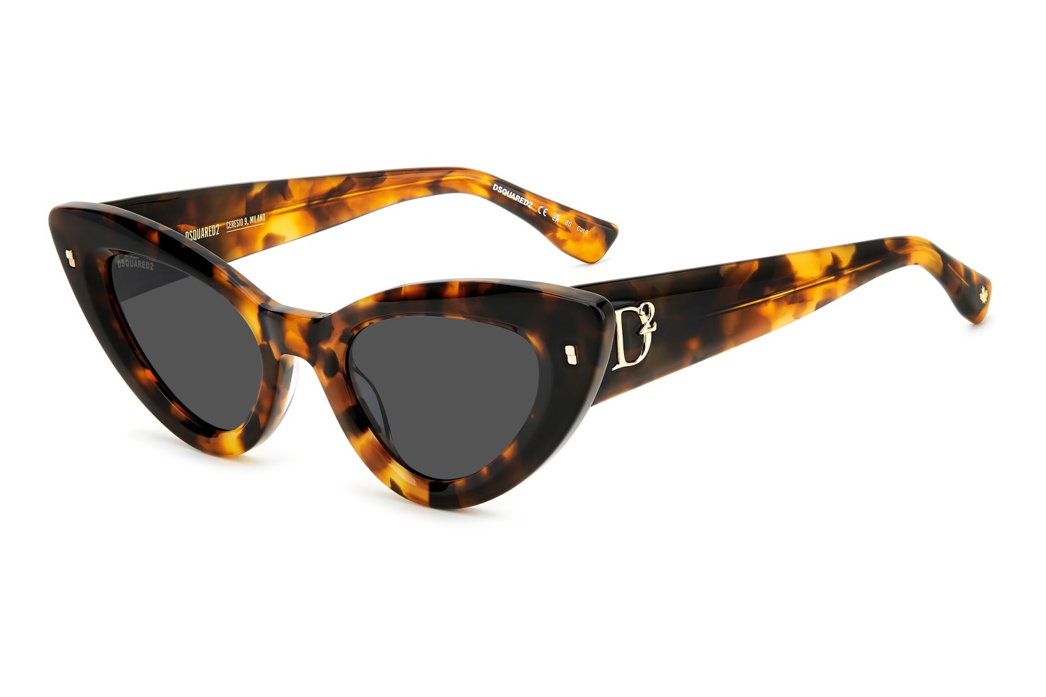 Immediately capturing one’s attention, these DSQUARED2 sunglasses in acetate feature a bold, cat-eye front and the brand’s original metal rivets on the outer corners. The sophisticated, feminine shape of the frames is complemented by a raised D2 logo on the temples, inspired by the woman's accessories, and by end tips decorated with the brand's quintessential maple leaf.