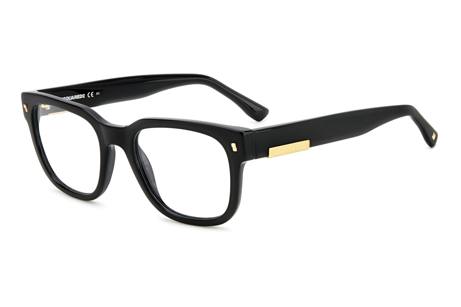 These masculine DSQUARED2 eyeglasses in acetate are unmistakable thanks to square frames accented by metal rivets in the upper corners, and bold temples that taper towards the end tips, trimmed by the brand's maple leaf. Another detail that distinguishes these men's glasses is the raised plaque on the temples, inspired by the tag found on DSQUARED2 jeans.