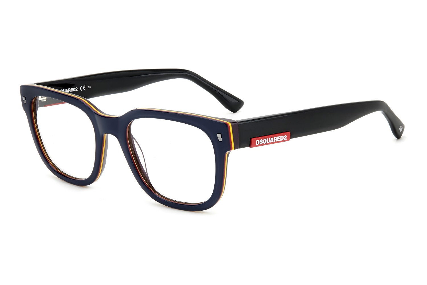 These masculine DSQUARED2 eyeglasses in acetate are unmistakable thanks to square frames accented by metal rivets in the upper corners, and bold temples that taper towards the end tips, trimmed by the brand's maple leaf. Another detail that distinguishes these men's glasses is the raised plaque on the temples, inspired by the tag found on DSQUARED2 jeans.