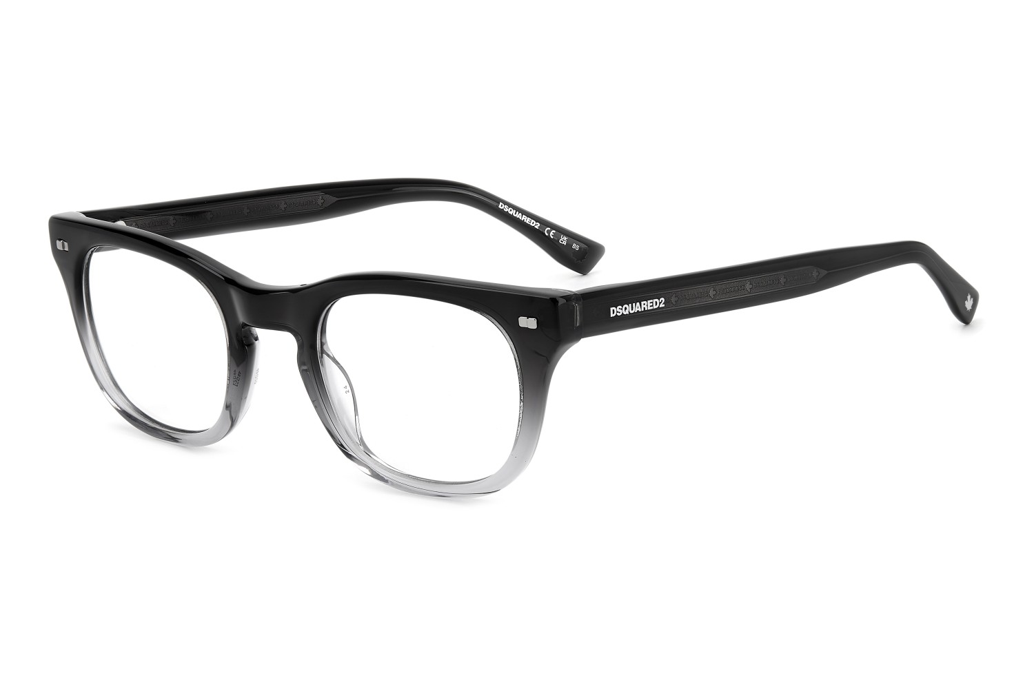 These semi-bold eyeglasses have been given a fresh twist thanks to the lighter proportions of the new acetate front. The metal core with the engraved DSQUARED2 'tape' can be seen through the original temples. The brand has also signed these men's glasses with an injected logo on the outer temple near the hinges, and with the must-have maple leaf on the comfortable end tips: distinctive features that convey truly unique design.