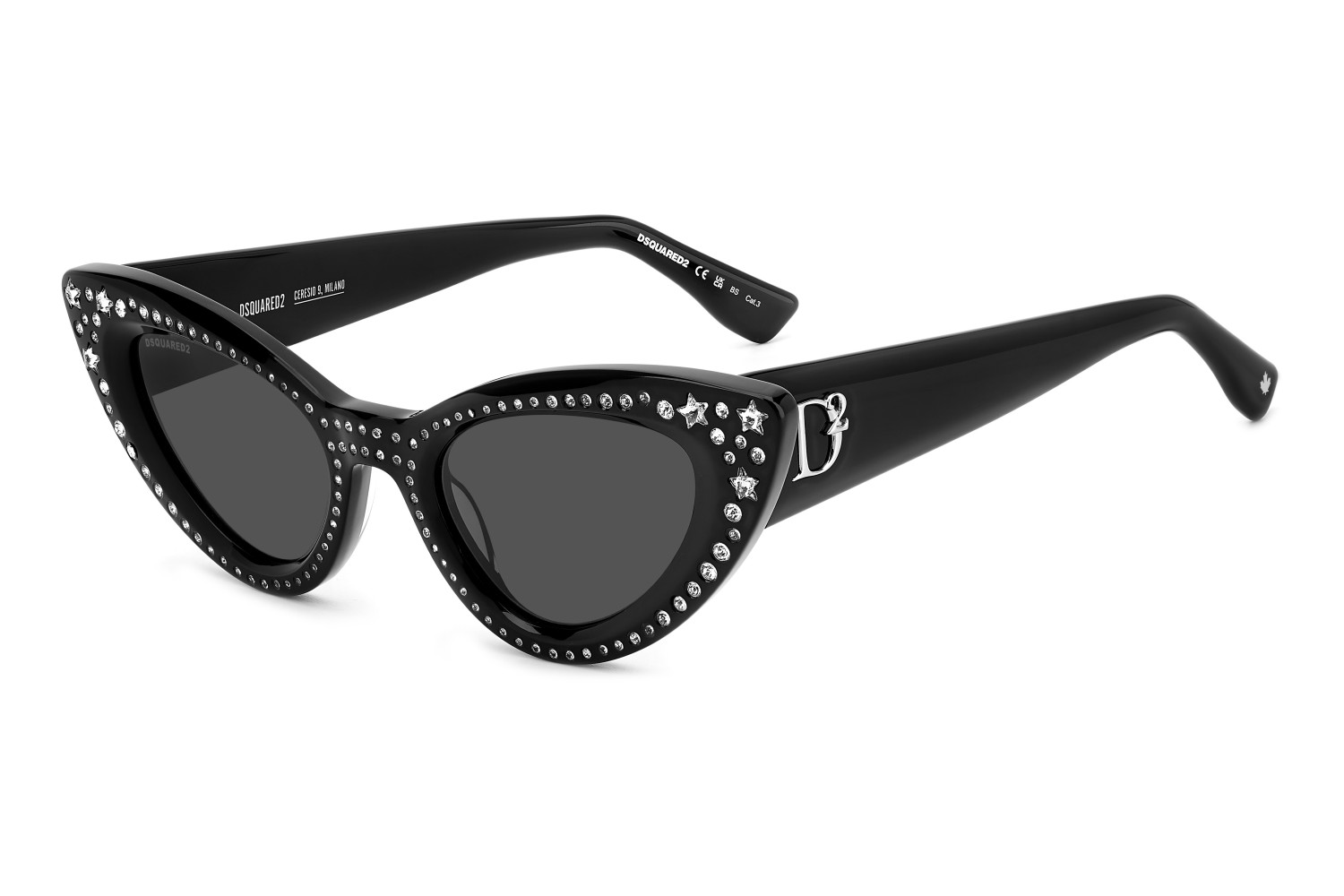 Immediately capturing one’s attention, these DSQUARED2 sunglasses in acetate feature a bold, cat-eye front with Swarovski crystals and the brand’s original metal rivets on the outer corners. The sophisticated, feminine shape of the frames is complemented by a raised D2 logo on the temples, inspired by the woman's accessories, and by end tips decorated with the brand's quintessential maple leaf.