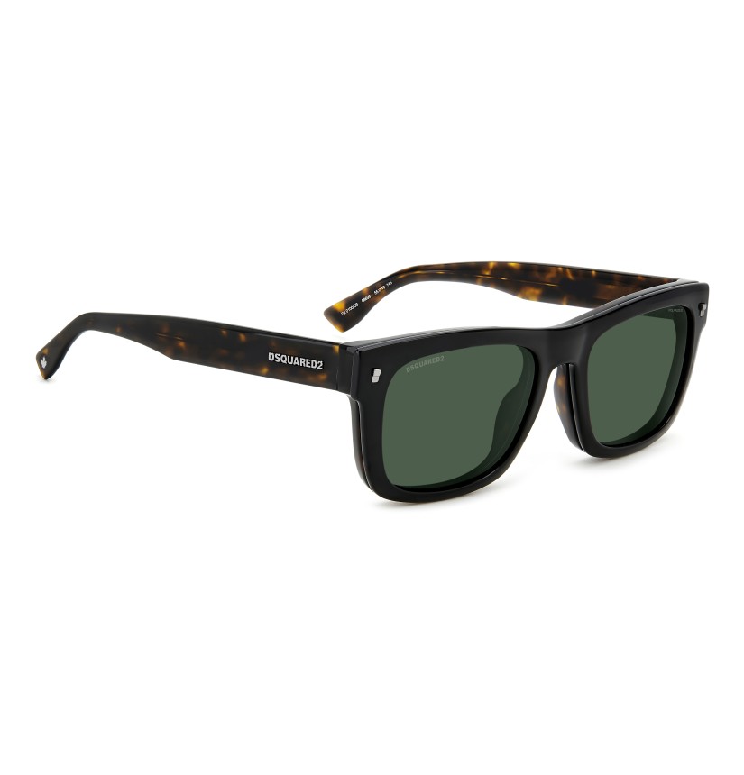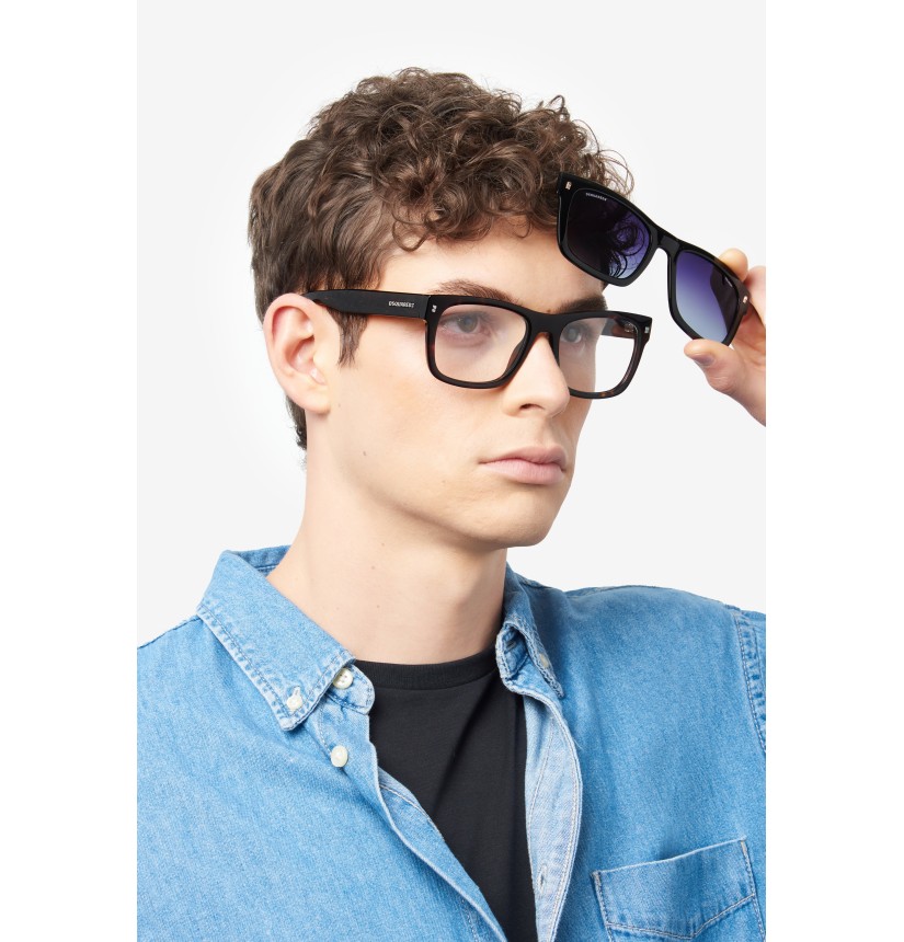 These men's eyeglasses have bold temples trimmed by a raised DSQUARED2 emblem and the CERESIO 9, MILANO inscription, plus the must-have maple leaf on the end tips. Their exclusive shape was inspired by the brand's accessories, and is enhanced by the bold acetate front with iconic metal rivets, giving these glasses plenty of personality.