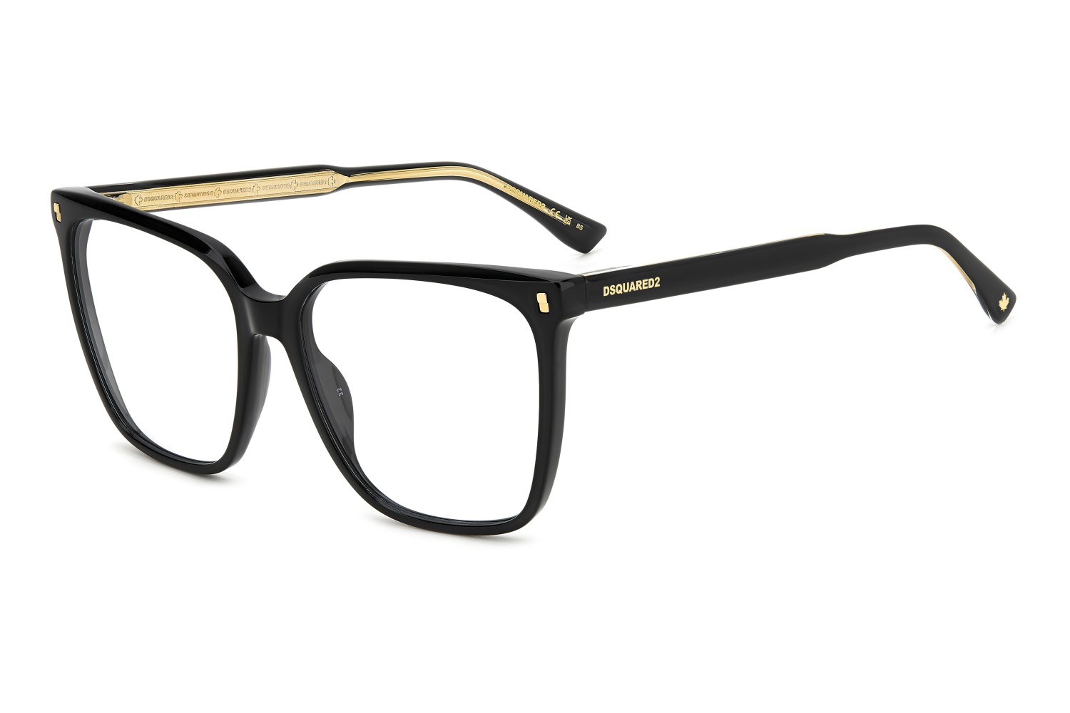 These eyeglasses for women by DSQUARED2 are a true gem to flaunt day after day. This light acetate frame has bevelled edges for a multifaceted look, offered in feminine shapes. Set against a classic colour palette, the brand's inserts stand out: rivets on the front, a DSQUARED2 logo, the CERESIO 9, MILANO inscription on the inside of the right temple, and the maple leaf on the end tips.