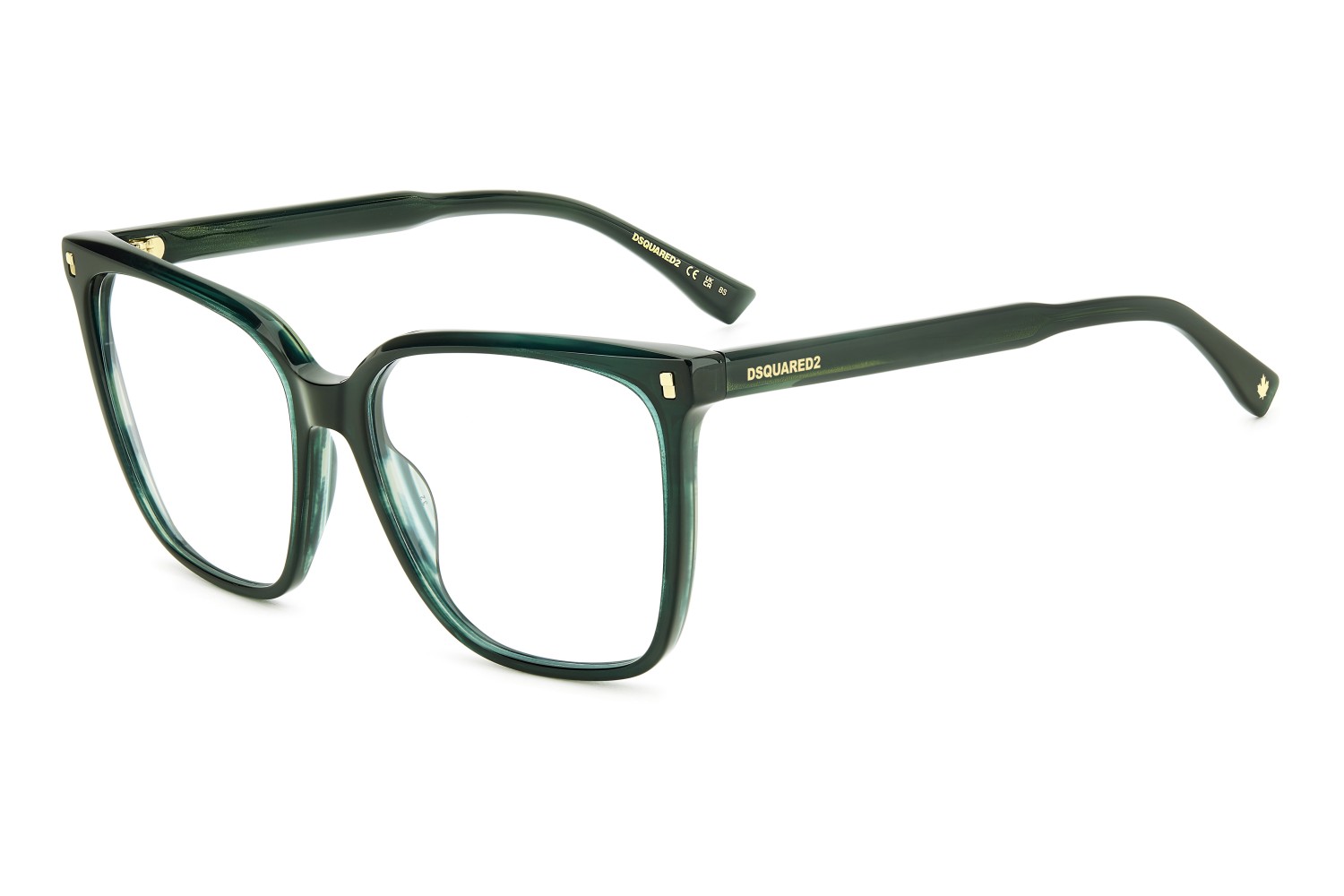 These eyeglasses for women by DSQUARED2 are a true gem to flaunt day after day. This light acetate frame has bevelled edges for a multifaceted look, offered in feminine shapes. Set against a classic colour palette, the brand's inserts stand out: rivets on the front, a DSQUARED2 logo, the CERESIO 9, MILANO inscription on the inside of the right temple, and the maple leaf on the end tips.