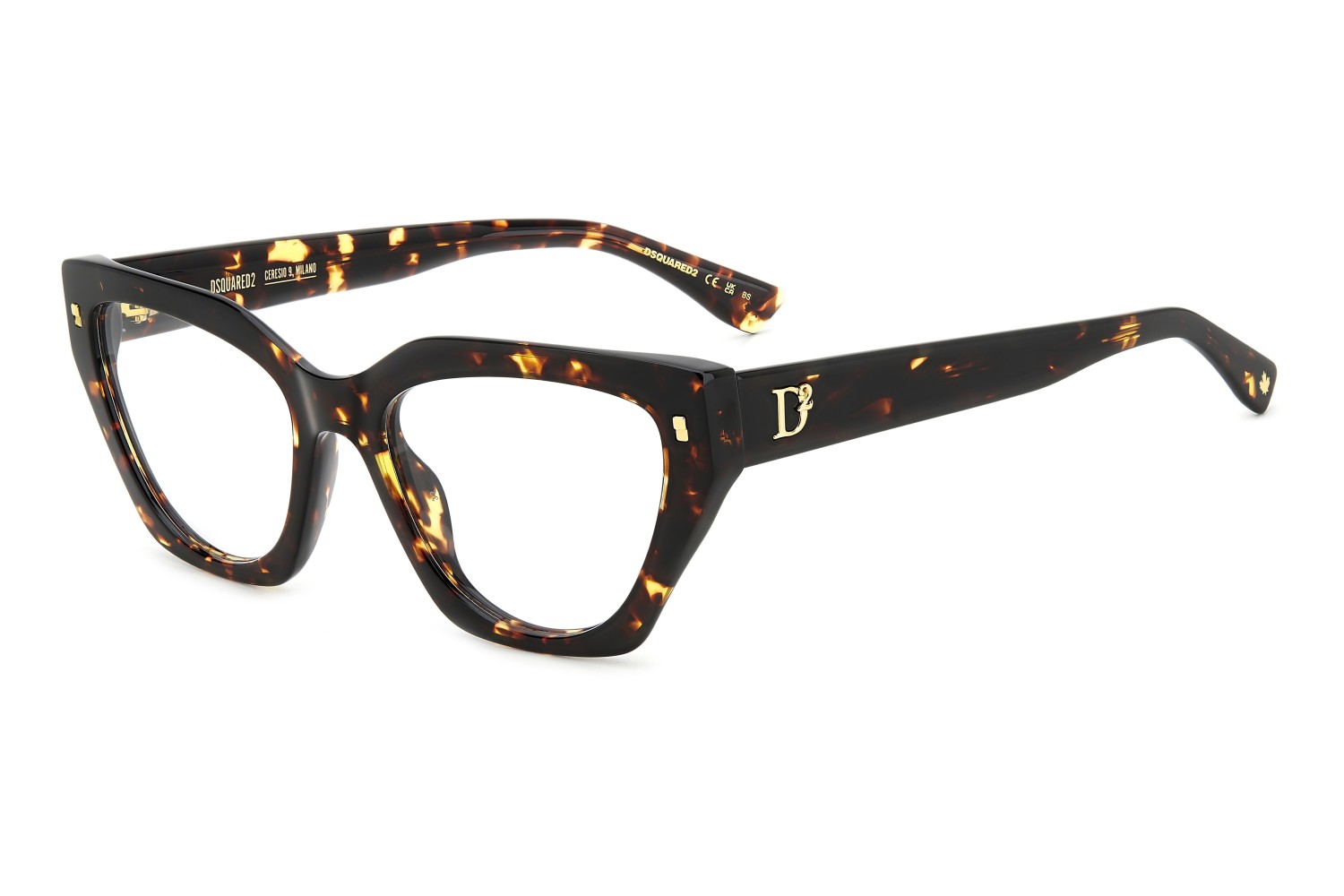 These eyeglasses for women by DSQUARED2 are a true gem to flaunt day after day. The acetate frames have bevelled edges for a multifaceted look, offered in feminine shapes. Set against a classic colour palette, the brand's inserts stand out: rivets on the front, a D2 logo, the CERESIO 9, MILANO inscription on the inside of the right temple, and the maple leaf on the end tips.