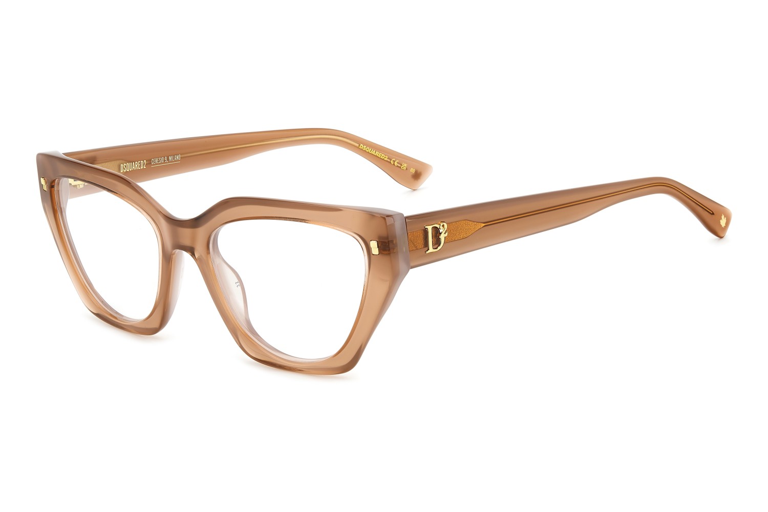 These eyeglasses for women by DSQUARED2 are a true gem to flaunt day after day. The acetate frames have bevelled edges for a multifaceted look, offered in feminine shapes. Set against a classic colour palette, the brand's inserts stand out: rivets on the front, a D2 logo, the CERESIO 9, MILANO inscription on the inside of the right temple, and the maple leaf on the end tips.