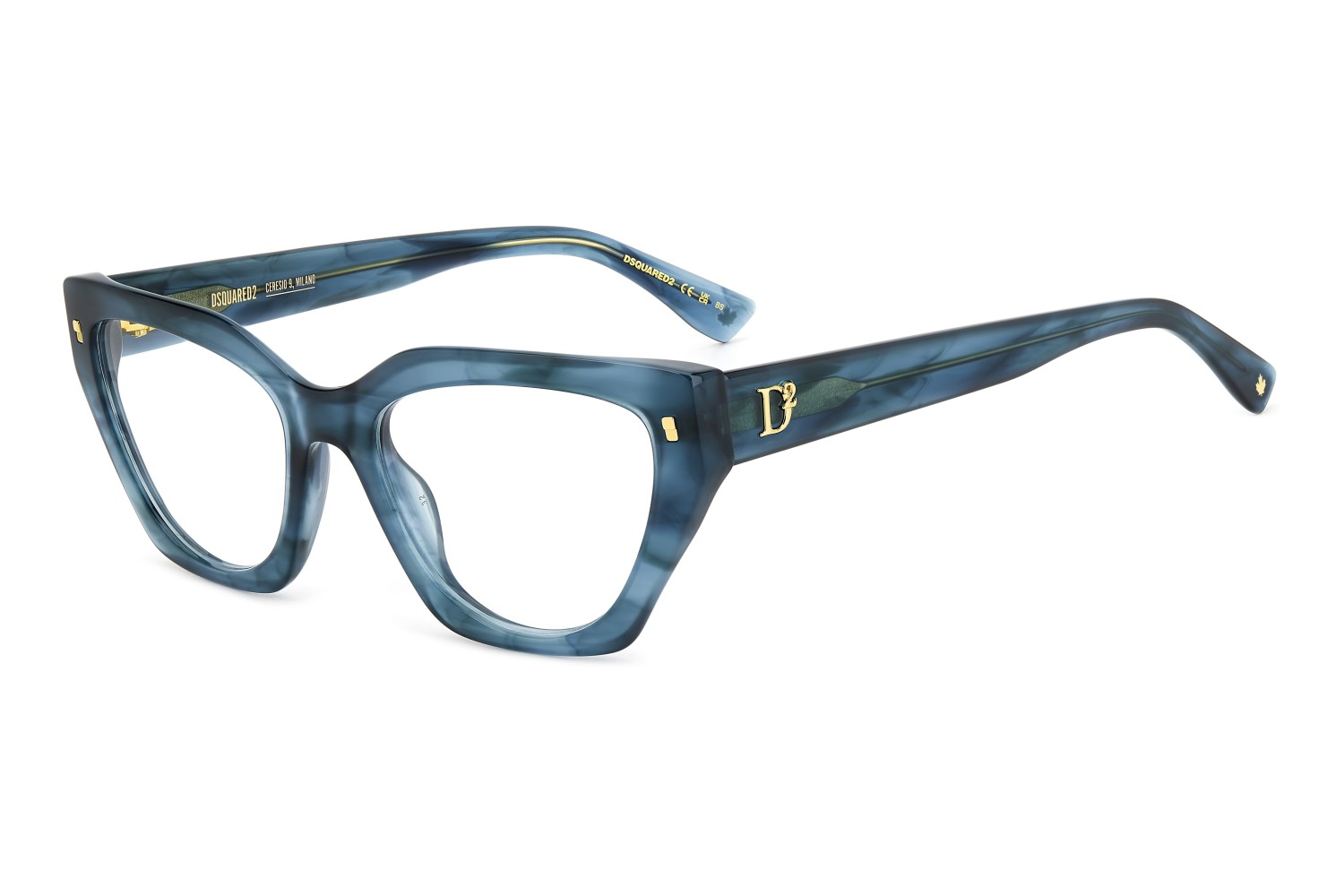 These eyeglasses for women by DSQUARED2 are a true gem to flaunt day after day. The acetate frames have bevelled edges for a multifaceted look, offered in feminine shapes. Set against a classic colour palette, the brand's inserts stand out: rivets on the front, a D2 logo, the CERESIO 9, MILANO inscription on the inside of the right temple, and the maple leaf on the end tips.