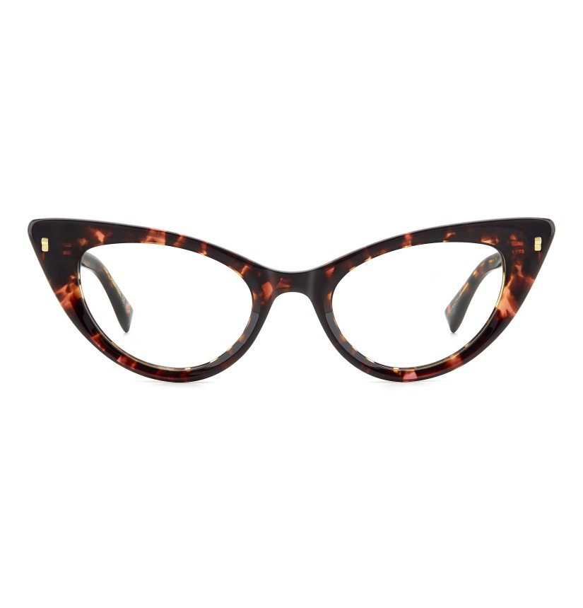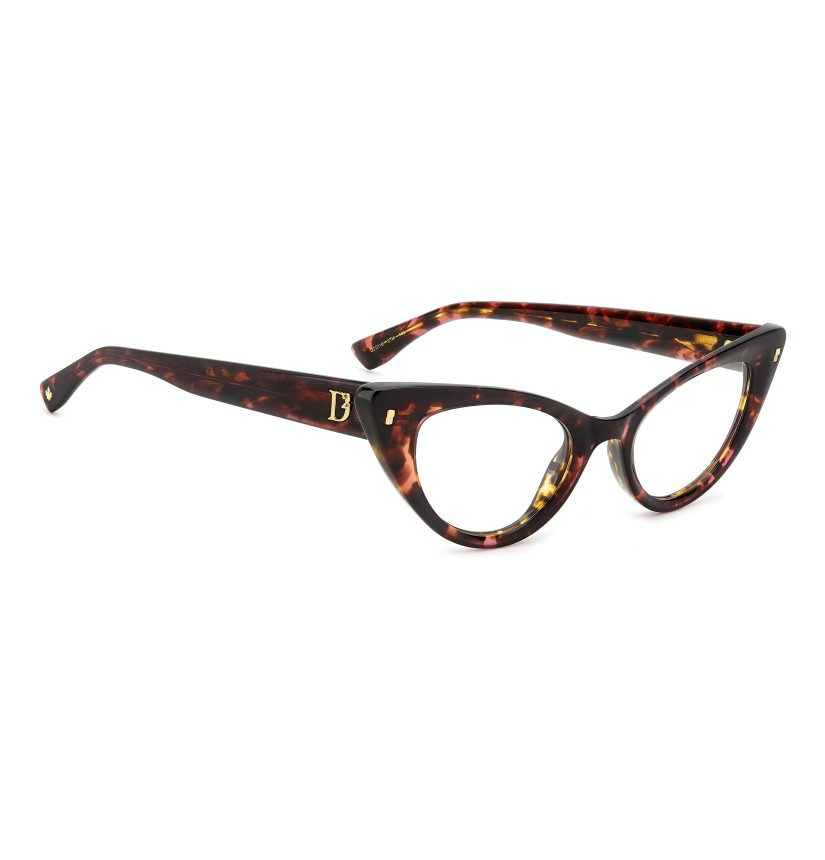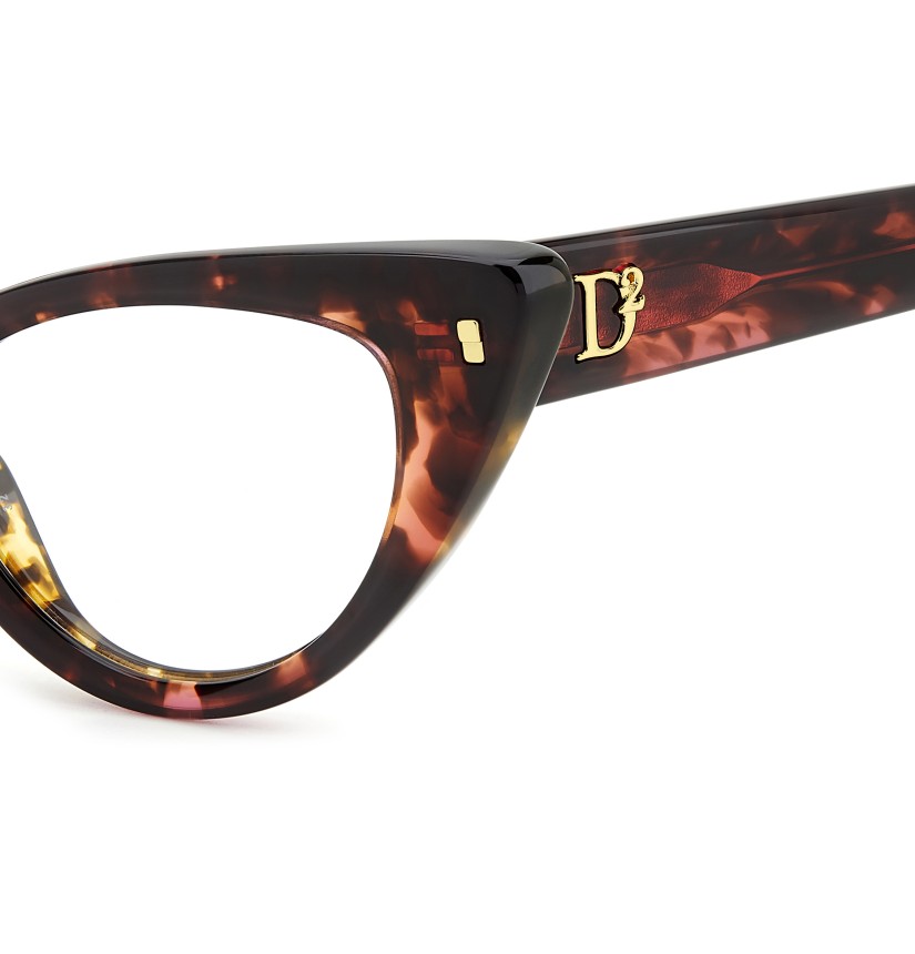 These eyeglasses for women by DSQUARED2 are a true gem to flaunt day after day. The acetate frames have bevelled edges for a multifaceted look, offered in feminine shapes. Set against a classic colour palette, the brand's inserts stand out: rivets on the front, a D2 logo, the CERESIO 9, MILANO inscription on the inside of the right temple, and the maple leaf on the end tips.