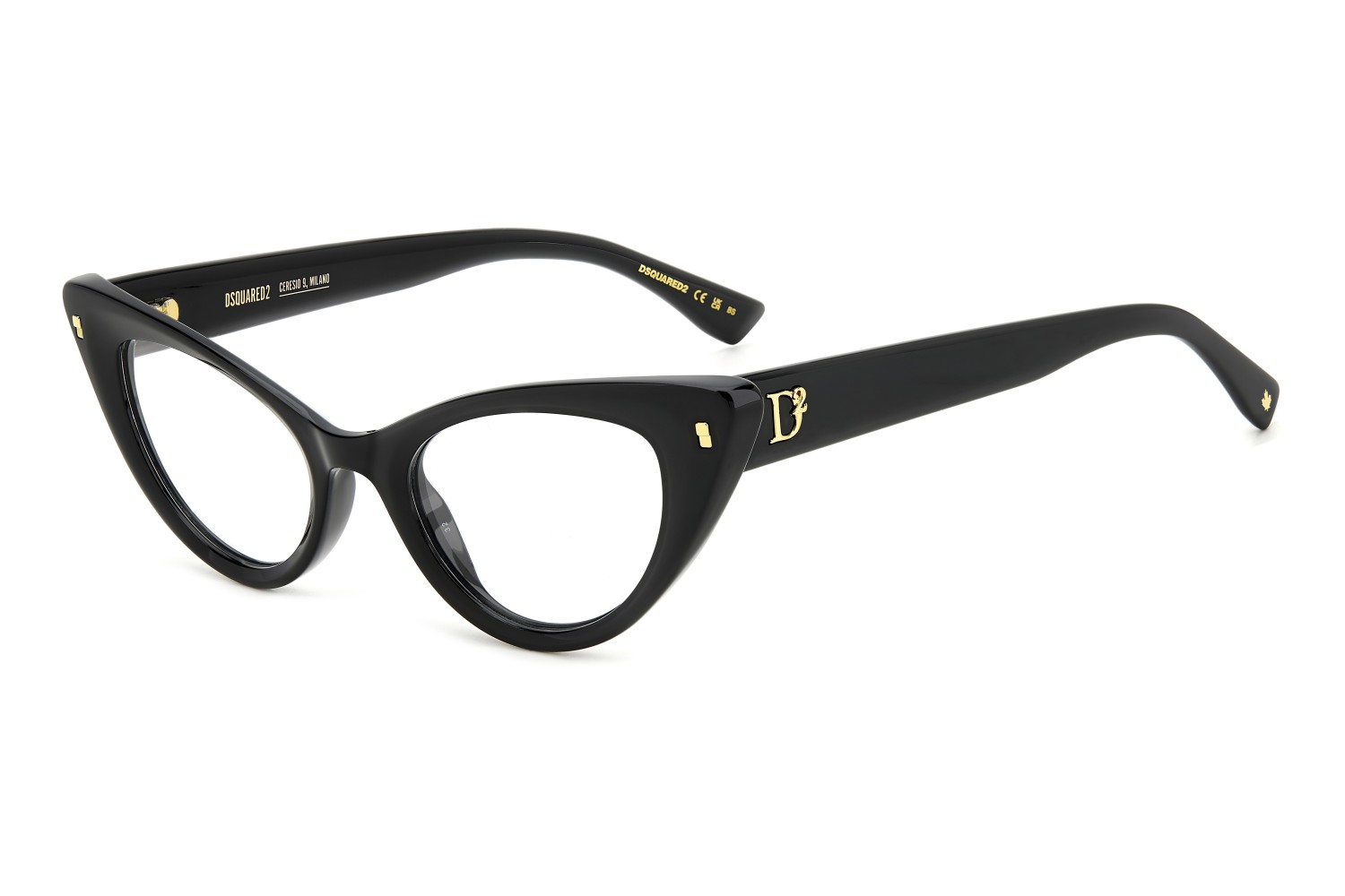 These eyeglasses for women by DSQUARED2 are a true gem to flaunt day after day. The acetate frames have bevelled edges for a multifaceted look, offered in feminine shapes. Set against a classic colour palette, the brand's inserts stand out: rivets on the front, a D2 logo, the CERESIO 9, MILANO inscription on the inside of the right temple, and the maple leaf on the end tips.