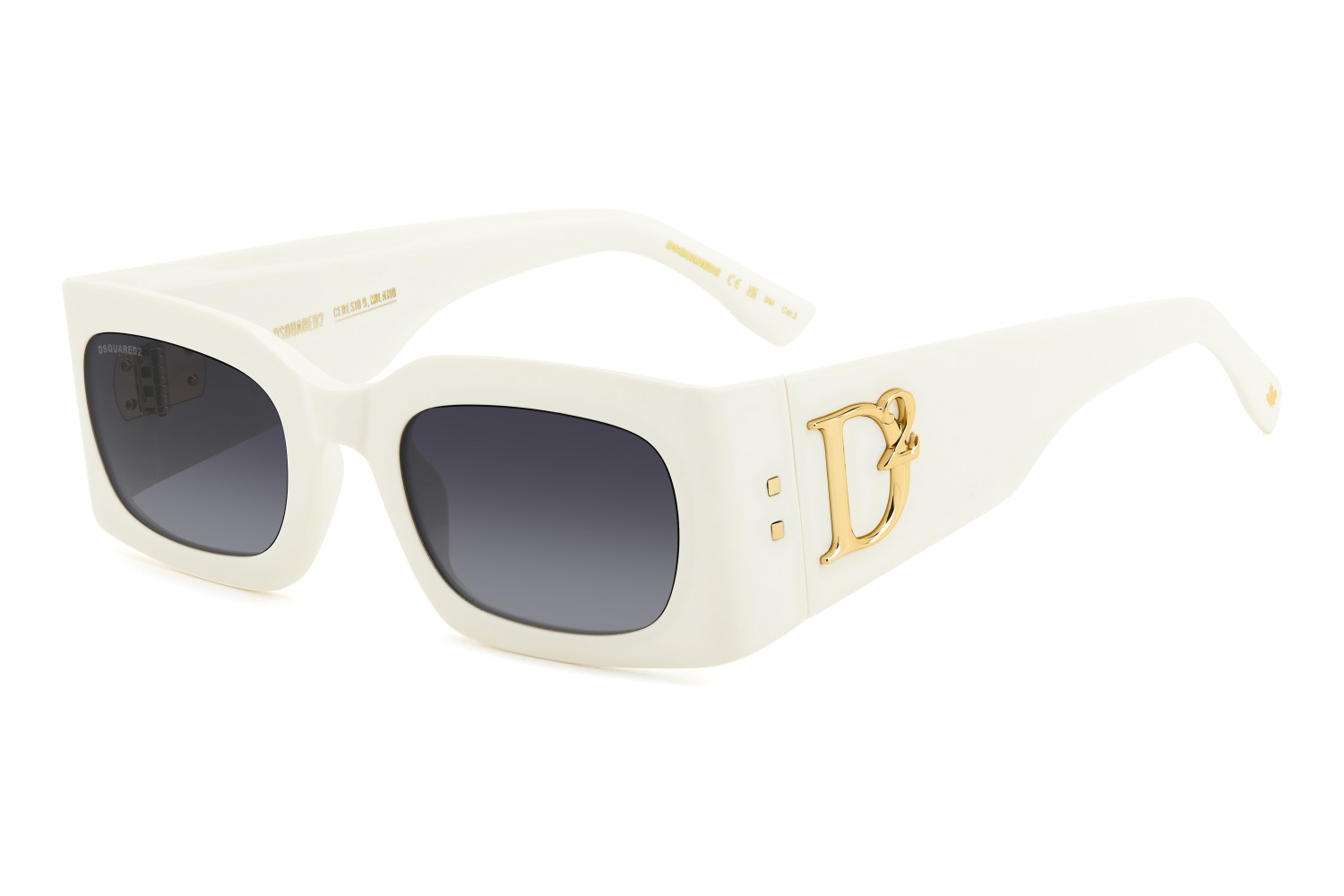 These DSQUARED2 sunglasses with bold acetate frames celebrate the distinct beauty of modern women. The low rectangular front is designed to hold prescription sun lenses, and is balanced by oversize temples. The brand is made clear from the details, such as the metal rivets and the maxi D2 logo. Closer inspection reveals contouring around the lenses, bent lugs, the CERESIO 9, MILANO reference on the inside of the right temple, and the brand's maple leaf symbol on the end tips.