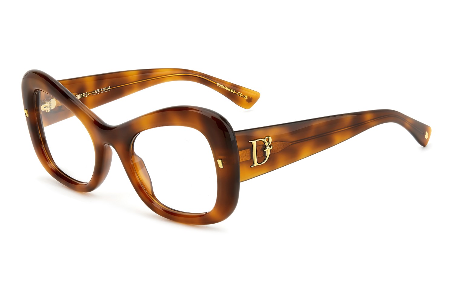 These women's eyeglasses by DSQUARED2 are anything but basic. A rounded butterfly shape and retro inspiration ensure their get-noticed quality. The acetate structure is offered in refined hues and in a horn effect, brightened by metal details: rivets on the front, a raised metal D2 logo, and the maple leaf on the end tips. The CERESIO 9, MILANO inscription is printed on the inside of the right temple.