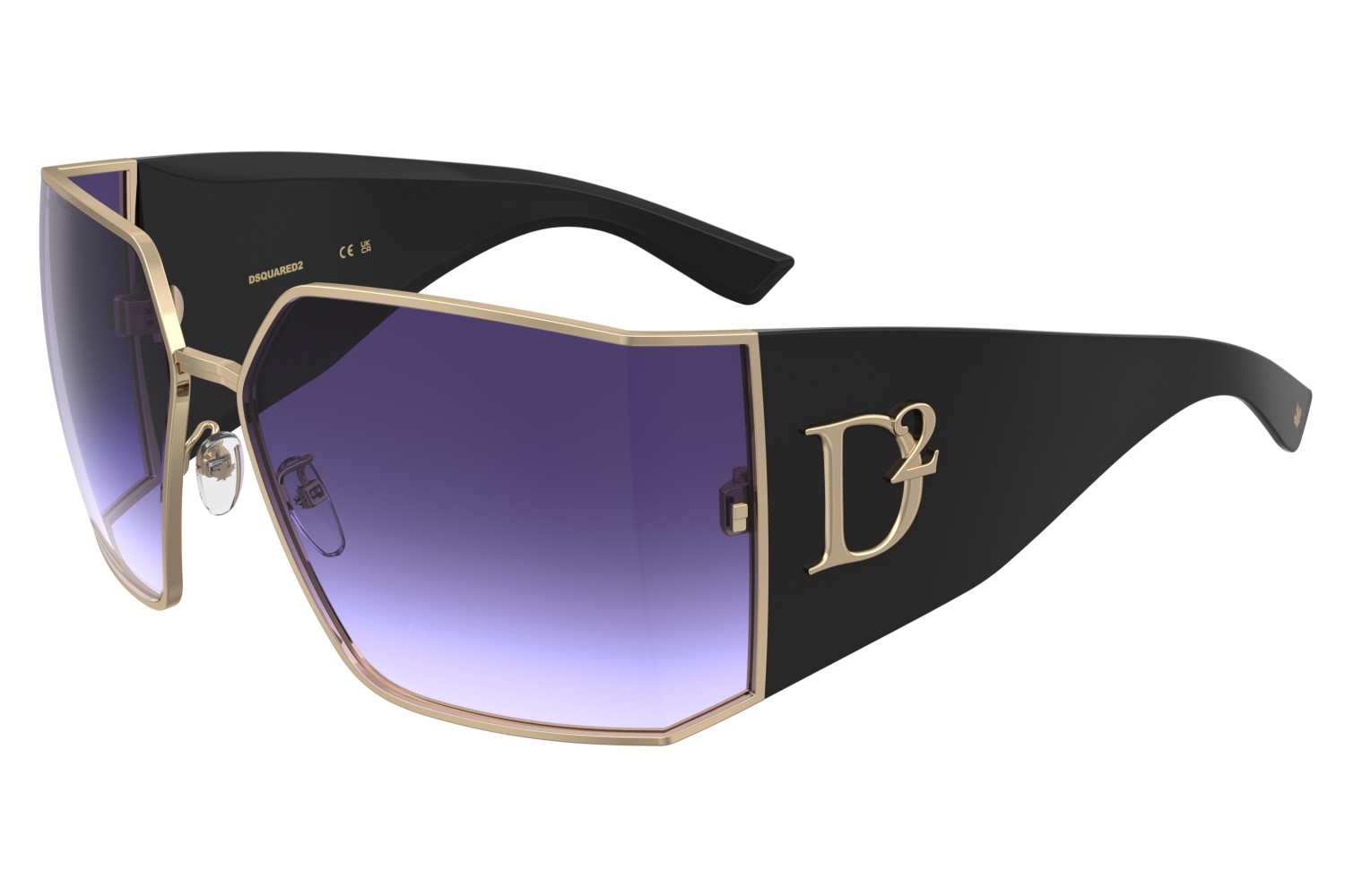 These sunglasses are already a collector's item, one of the most sophisticated women's eyewear looks from DSQUARED2 this season. The meticulous construction of the metal front is their signature, crafted into an angle at the sides to hold the wrap-around maxi lenses, trimmed by the iconic rivets. The nose pads are customised by the brand's maple leaf, also found on the end tips. The oversize D2 logo in relief trims this unique pair of glasses.