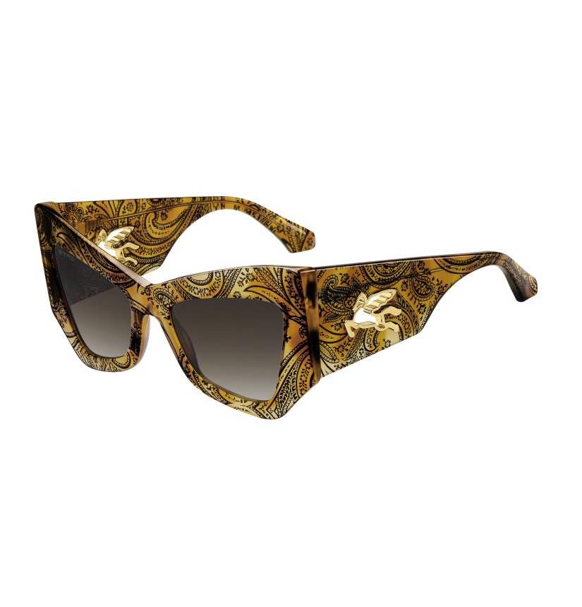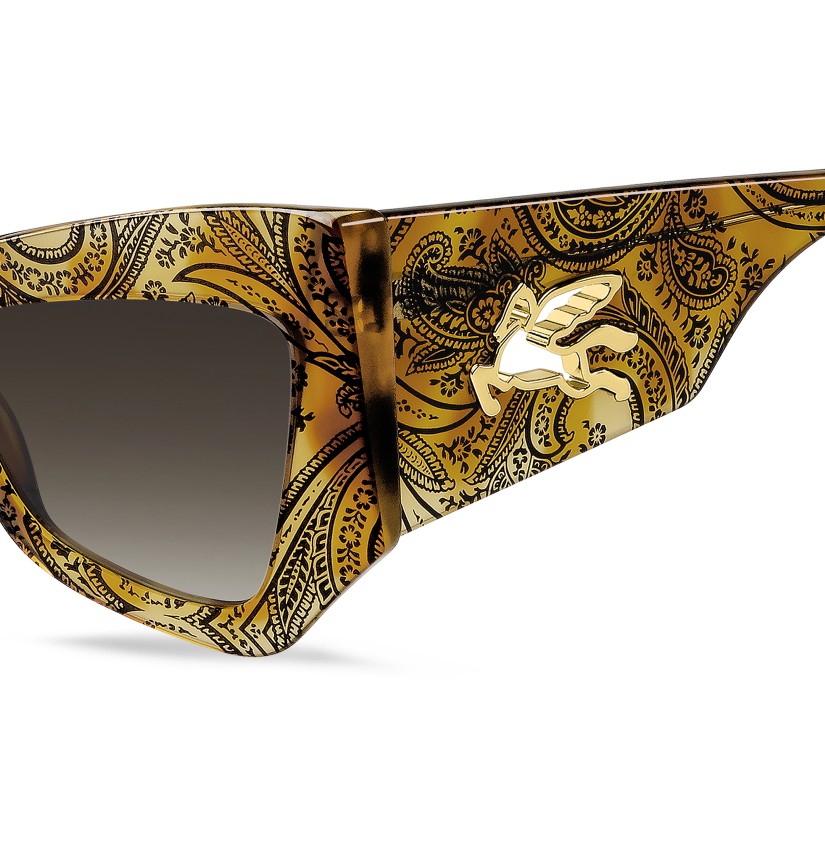 A powerful fashion statement – these sunglasses embrace the mood of ETRO's latest runway show. The striking angular shape is crafted from premium acetate, available in black, burgundy and the distinctive Paisley pattern. Notice the innovative construction of the temples, combining a subtle milled effect with a one-piece metal trim depicting the mythical Pegasus. The iconic end tips and logo lettering on the tinted lenses complete this daring pair.