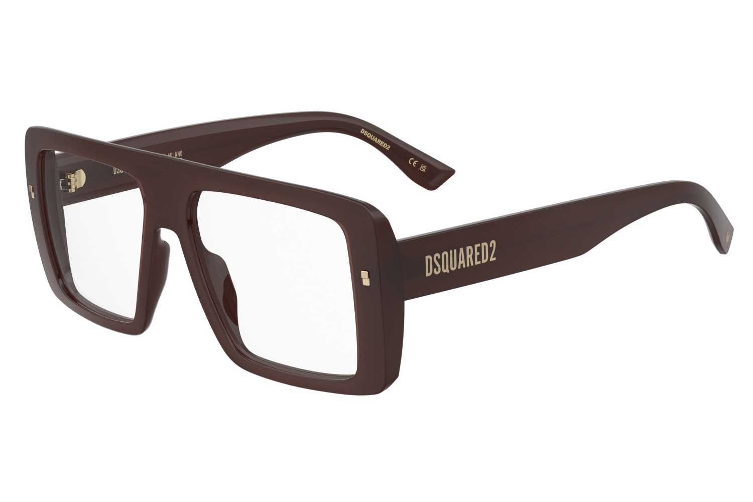 The bold look of DSQUARED2 is expressed in these men’s eyeglasses. The acetate front entices with its notable volumes and proportions, yet it remains lightweight thanks to bevelling on the inside. Even the pared-back size of the temples contributes to their everyday wearability, accented by the DSQUARED2 logo – a symbol of the brazen glamour which the brand is known for. The square rivets and the maple leaf on the end tips complete this must-have look.